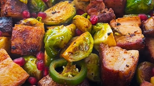 Need to impress your guests with a colorful side dish? Well, you’re going to do just that with this festive Pork Belly & Brussels Sprouts Skillet from Brad Prose, garnished with pomegranate seeds and fresh lime juice.