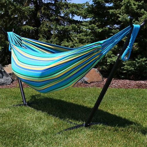 Your favorite couple can cuddle up in this stylish double hammock that fits 2 thanks to the tight-woven Brazillian coccoon design. Shop Ultimate Patio Brazilian Double HammockThe Accessory Aisle
