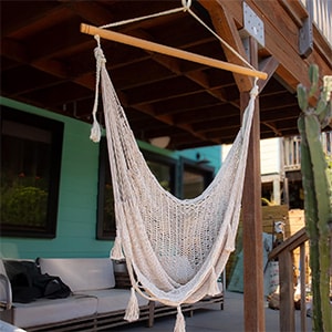 Instead of “How many bathrooms?” the question will be “How many people can fit on that hammock?” Two, to be exact, thanks to Brazilian cocoon design. Shop Ultimate Patio Decor Brazilian Double Hammock