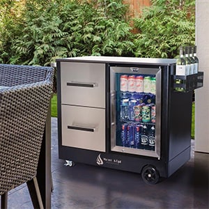 Hosting housewarming guests is easy with this large prep center and bar cart from Mont Alpi, complete with outdoor rated refrigerator to store and serve drinks. Shop Mont Alpi Outdoor Prep Center