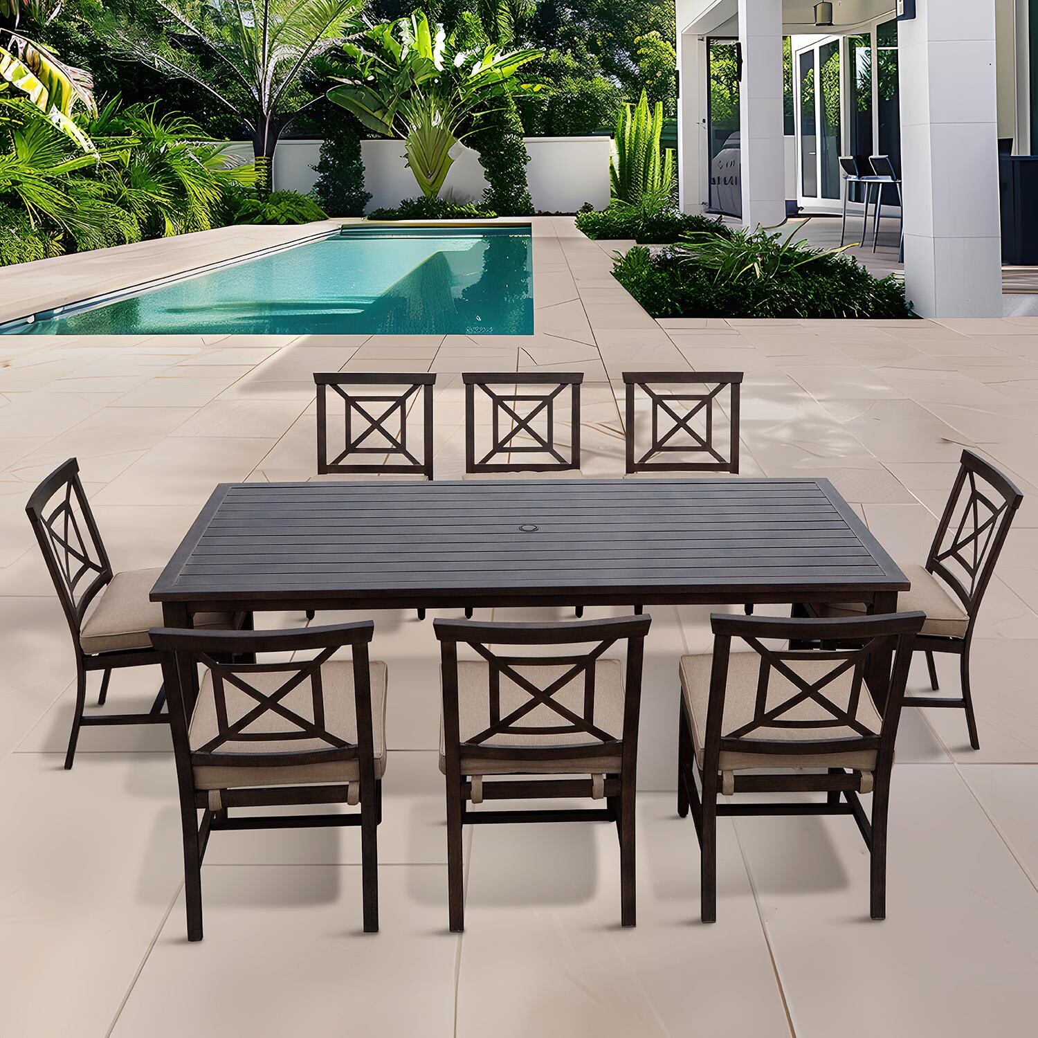 Nine-piece patio dining sets are capable of fitting either seven or eight people around circular, square, or rectangular tables. Though these tables are quite large, the variety of shapes is really helpful when trying to create a design that has everything you need.