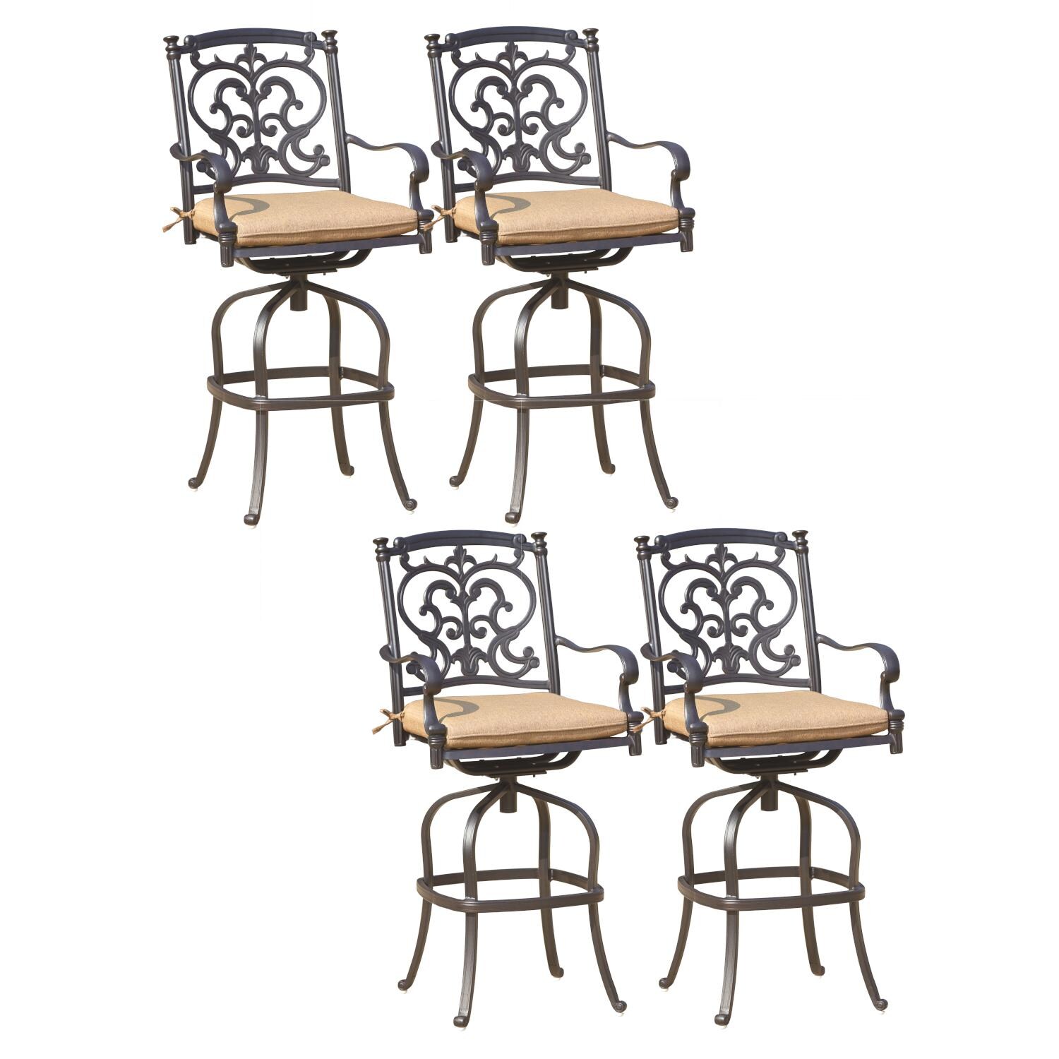 The Elisabeth Collection also provides a variety of seating sets. The largest seating set includes 12 pieces and can seat eight people. Included in this set is a sectional sofa, club chair, ottoman, coffee table and two end tables with ice bucket inserts. This set is versatile and provides extra comfort with plush 3-inch thick cushions to relax on. Elisabeth also offers club chairs, swivel rocker club chairs, and spring base rocker chairs. These chairs are available in multiple different seating sets. The table offered as part of Elisabeth’s conversation sets includes both a fire pit to warm up on chilly nights and an ice bucket insert to keep drinks cool year-round. There are two bar sets available in the Elisabeth Collection: a 5-piece and a 3-piece. The 5-piece set comes with four bar-height swivel bar stools and the 3-piece set is accompanied by two counter-height swivel bar stools. Additionally, a bench glider is also offered in this collection to add versatility to your patio.