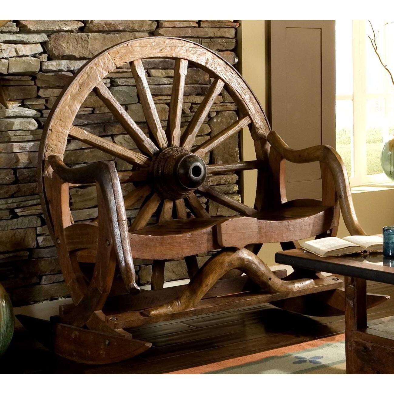 The Groovy Stuff Teak Wood Arapaho Rocker - TF-735. The Arapaho Rocker is a Wagon Wheel Rocker constructed of parts from Wagon Wheels and Ox Carts with Teak Wood. Perfect for your porch or any entryway. DUE TO THE UNIQUE CRAFTING, THIS ITEM MAY VARY IN SHAPE, SIZE AND COLOR. Dimensions (in inches): 45 W x 31 D x 48 H.