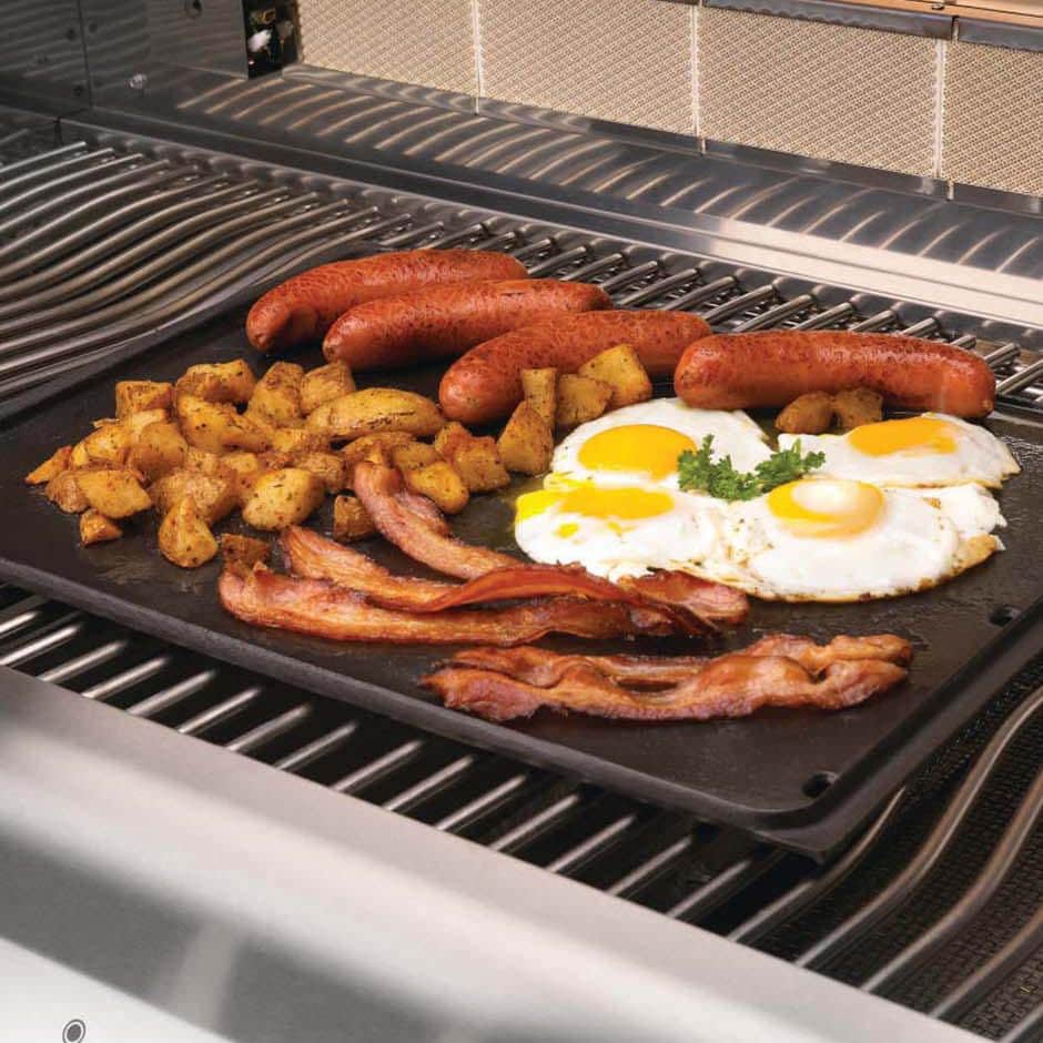 - The flat side of the griddle is ideal for caramelizing onions and cooking breakfasts on the barbecue grill