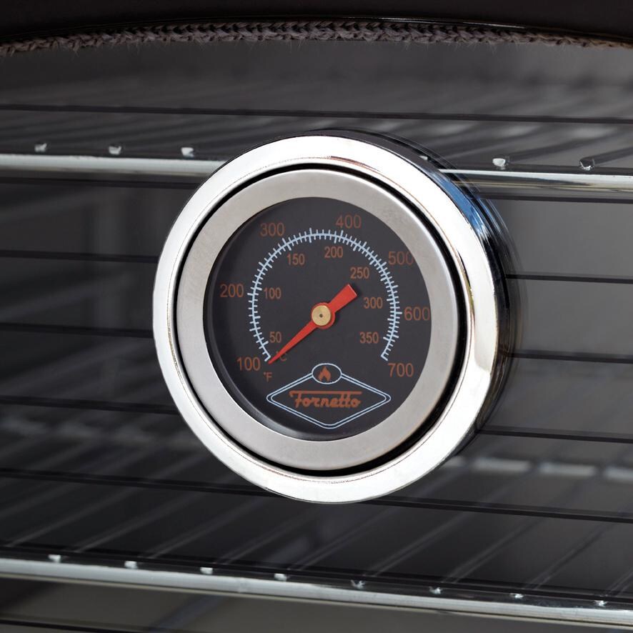 Created with the home chef in mind, Fornetto ovens provide an exceptional outdoor cooking experience with practical features and attractive design. The Alto outdoor oven is built using premium materials and finishes, the stainless steel oven exterior is finished with a durable powder coating in black, complimented by gloss enamel-finished cast-iron oven chamber and fire box doors in brick red. Roomy enough to fit a family roast, the 16.15 gallon capacity oven chamber measures 18.7 by 15.8-inches and features a 9-position adjustable shelf system. Control the flow of air and smoke to infuse foods with authentic smoky flavor using 3 heat-proof airflow valves and an adjustable damper handle, all featuring a cool-touch phenolic-finish. Smoking chips and aromatic woods can be added to the removable door-mounted smoker box, designed to allow smoke to flow directly from the fire box to the oven chamber. A temperature gauge built into the glass oven window provides a practical way to accurately monitor cooking temperatures, while electric halogen oven lighting lets you keep an eye on food without opening the door. Keep food warm without overcooking, warm up serving plates and platters or even proof doughs using the smooth-rolling warming drawer, fit with its own temperature gauge. The chimney flue and cowl were designed with a standard 5.9-inch diameter and can easily be extended for custom outdoor kitchen installations. The Fornetto Alto includes an all-weather cover, wire pizza stone rack, 2 wire racks, 3 fire bricks, a pizza stone, a fire box wood rack and ash tray. Some assembly is required.