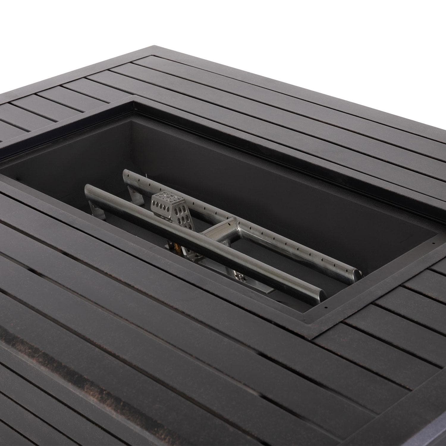 Venza from Ultimate Patio is a multi-function fire pit table that doubles as an outdoor patio table with the included cast aluminum fire bowl cover.