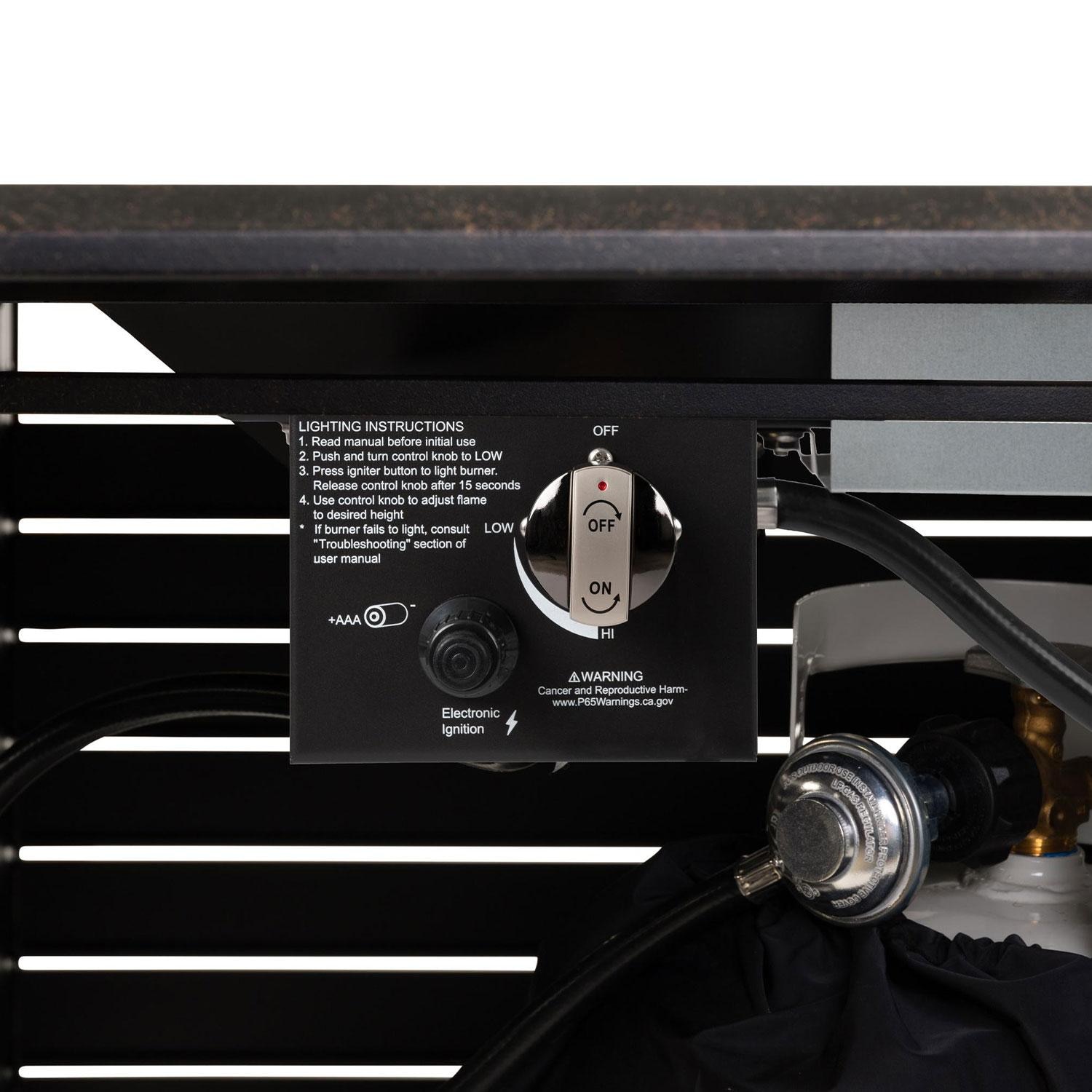 This fire pit table operates on a standard 20 lbs propane tank which is stored safely underneath the unit and is accessible through a hinged door. A propane tank cover is included to protect the tank from the elements.