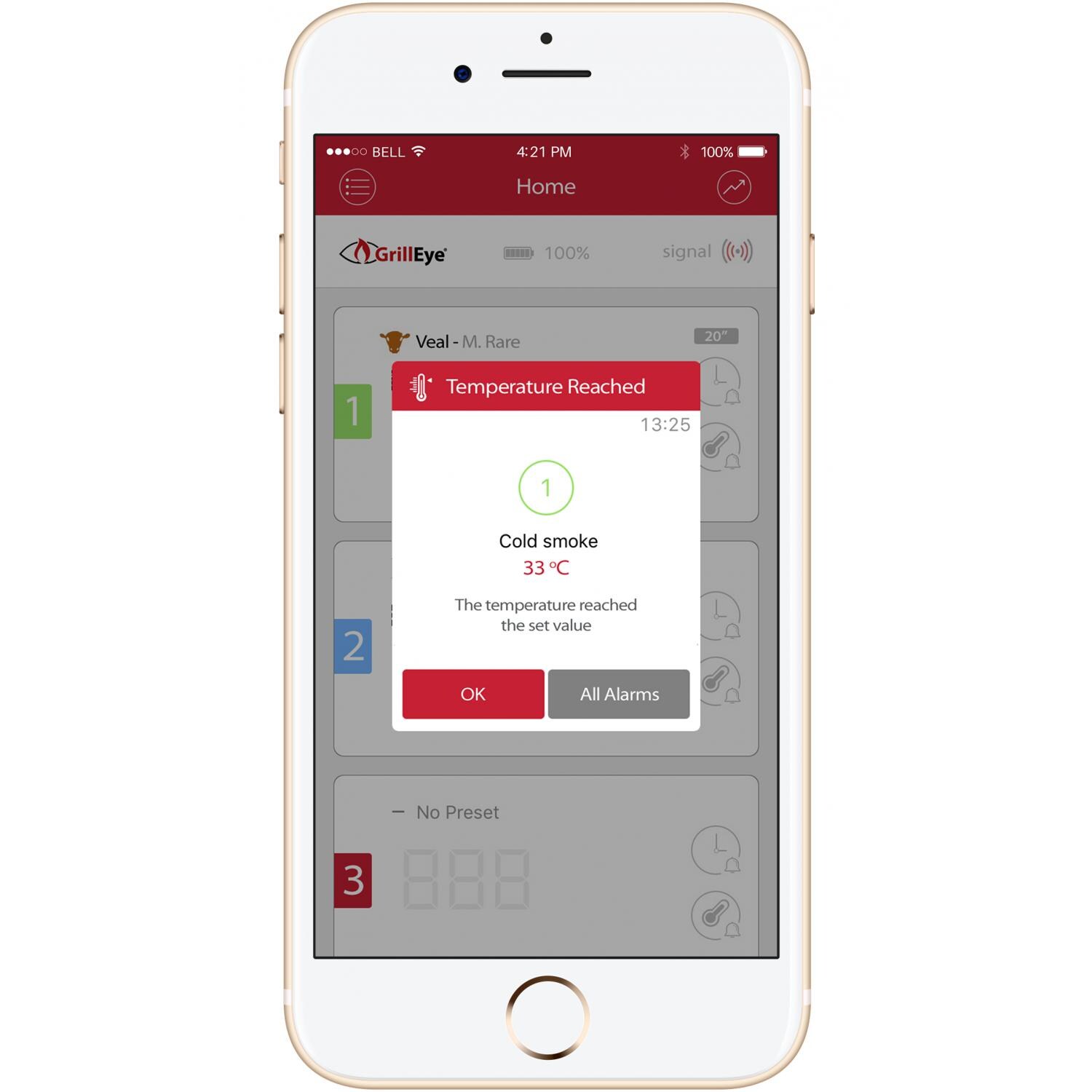 - App alerts you when your food or grill has reached set temperature, fallen out of range or when your food is done cooking