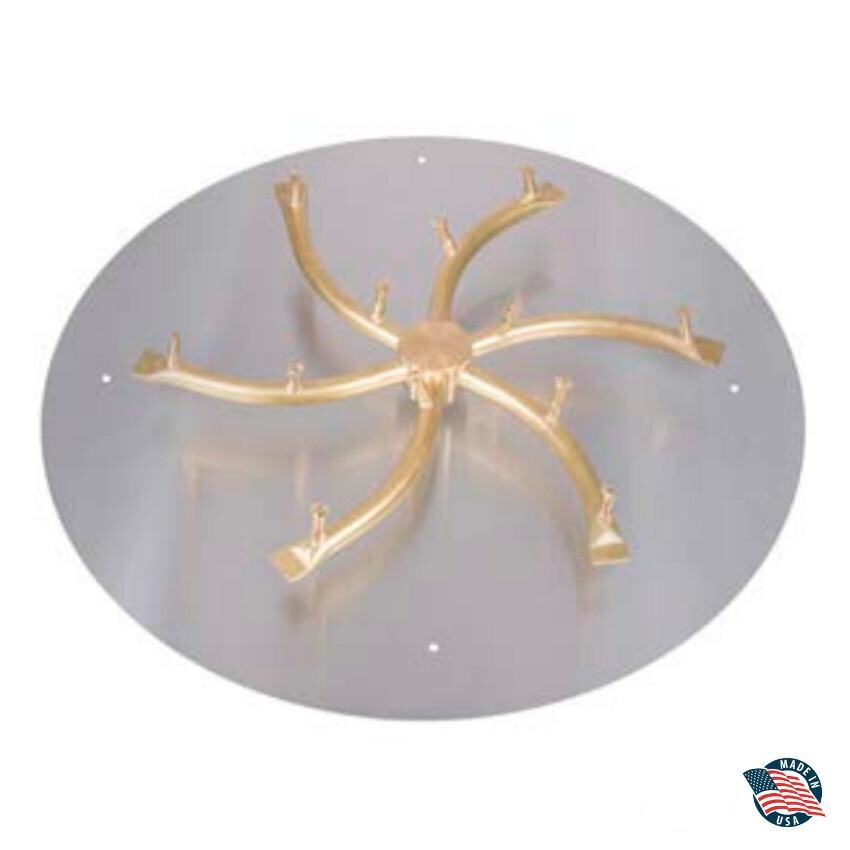 Made from high grade Brass, the patented Bullet Burner can swap in for standard burners as an upgrade for any pre-existing or new fire pits, providing you with a fuller flame while consuming less gas. The patented hub distributes gas evenly while the curved design of the S Burner creates a fuller flame. Bullet Burner orifices compress gas flow and incorporates oxygen to create a cleaner flame and eliminates the need for an additional air mixer when using liquid propane. Each bullet burner is individually hand crafted in the USA. Featuring a half inch male hub and a diameter of 24 inches this bullet burner produces a maximum of 200,000 BTUs. Aluminum Flat Pan is round with a diameter of 30 inches. Burner tips must be exposed before igniting. This unit includes an on/off remote control with a 12V electronic ignition system that will relight your fire pit if wind blows it out. The electronic ignition can also be wired by your local electrician to be controlled by a light switch, pool controller (with available relay), or home automation system.