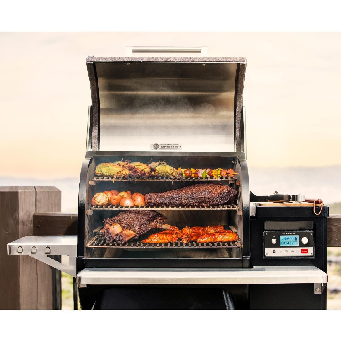 Join the Hall of Flame with the Traeger Timberline 850. Grill more food and enjoy more versatility with 850 square inches of cooking area over three tiers of dual-position stainless steel cooking grids. The bottom cooking grate can be lowered for searing juicy steaks, or raised for grilling. Cook up to 38 burgers, 6 chickens, 54 hot dogs or 9 rib racks 20% faster and with more smoky flavor than ever thanks to the TRU Convection system and Traeger Downdraft Exhaust system, fully circulating fresh blue smoke using a built-in induction fan. The Timberline features a double-walled 304 stainless steel interior and airtight lid gasket to insulate and maintain heat for unbeatable temperature control from 165-500 degrees Fahrenheit. An easy to use control panel & digital display gives you full control with a navigation dial and dedicated buttons for creating custom cook cycles and quick access to handy functions like keep warm mode and Super Smoke Mode, amping up the flavor with the push of a button. Tired of babysitting your grill? Try out the WiFIRE controller to change the temperature, set timers, and access thousands of Traeger recipes using the Traeger app and your smart phone (available for iOS & Android devices). The included meat probe stores above the control panel for quick access, easily connecting to a dedicated control panel port for precise monitoring. There's no shortage of food prep convenience with a stainless steel side shelf with BBQ tool hooks, a full-length stainless steel front-shelf and a magnetic bamboo cutting board that stores above the pellet hopper. Keep the fire burning with an extra large capacity pellet hopper, holding up to 24 pounds of Traeger hardwood pellets. A pellet sensor in the hopper allows you to keep track of fuel levels using the Traeger app and alerts you when the hopper is running low. A hopper clean-out door lets you quickly empty contents for cleaning and swapping out flavors. Tucked away out of sight, is a concealed grease pan slides out for easy cleanup. The Timberline is built to outlast the competition from the ground up with a rock-solid sawhorse-style chassis, all-terrain wheels, heavy-duty locking casters and black powder coat finish.