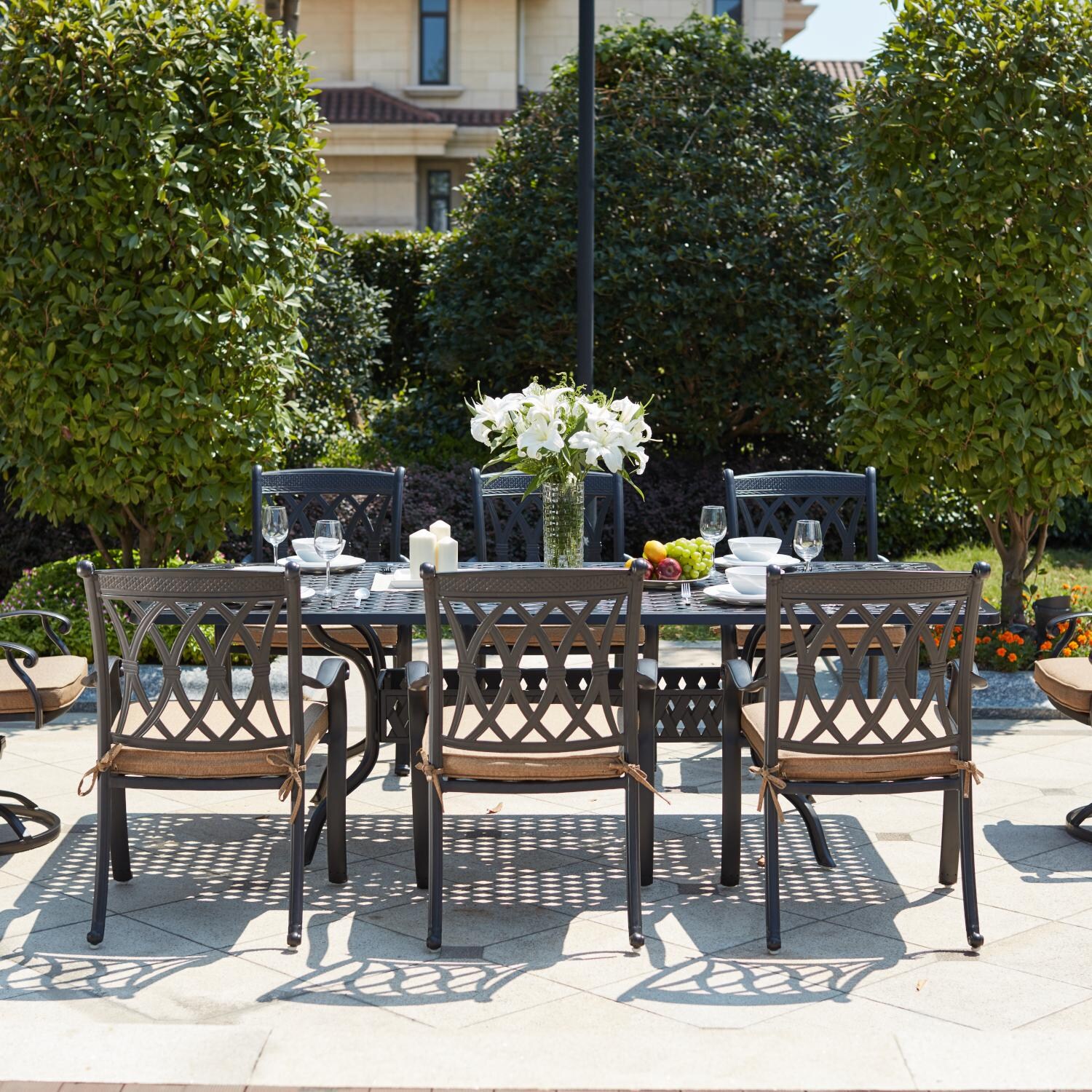 - Set Includes: Dining Table, 6 Dining Arm Chairs, 2 Swivel Rocker Chairs and Cushions