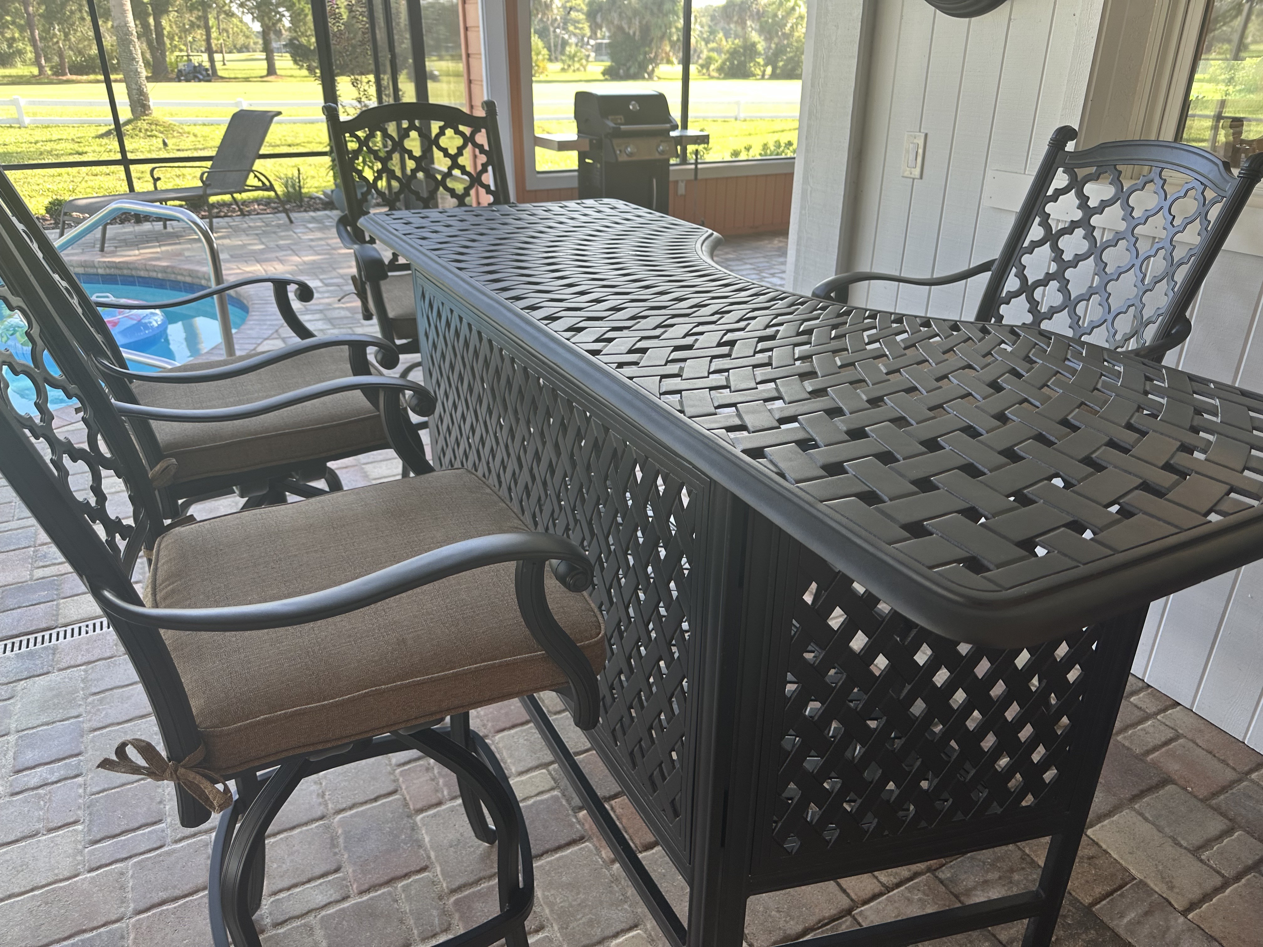 This is my second Darlee purchase. The forged aluminum is stylish and exceptionally strong. The cushions are very comfortable. The only downside of this product is the fact that the top does not overhand the base on the front side of the bar. This makes it difficult to get close to the bar for eating and/or drinking. The online pictures are deceiving. Be aware if this is important to you, otherwise great product