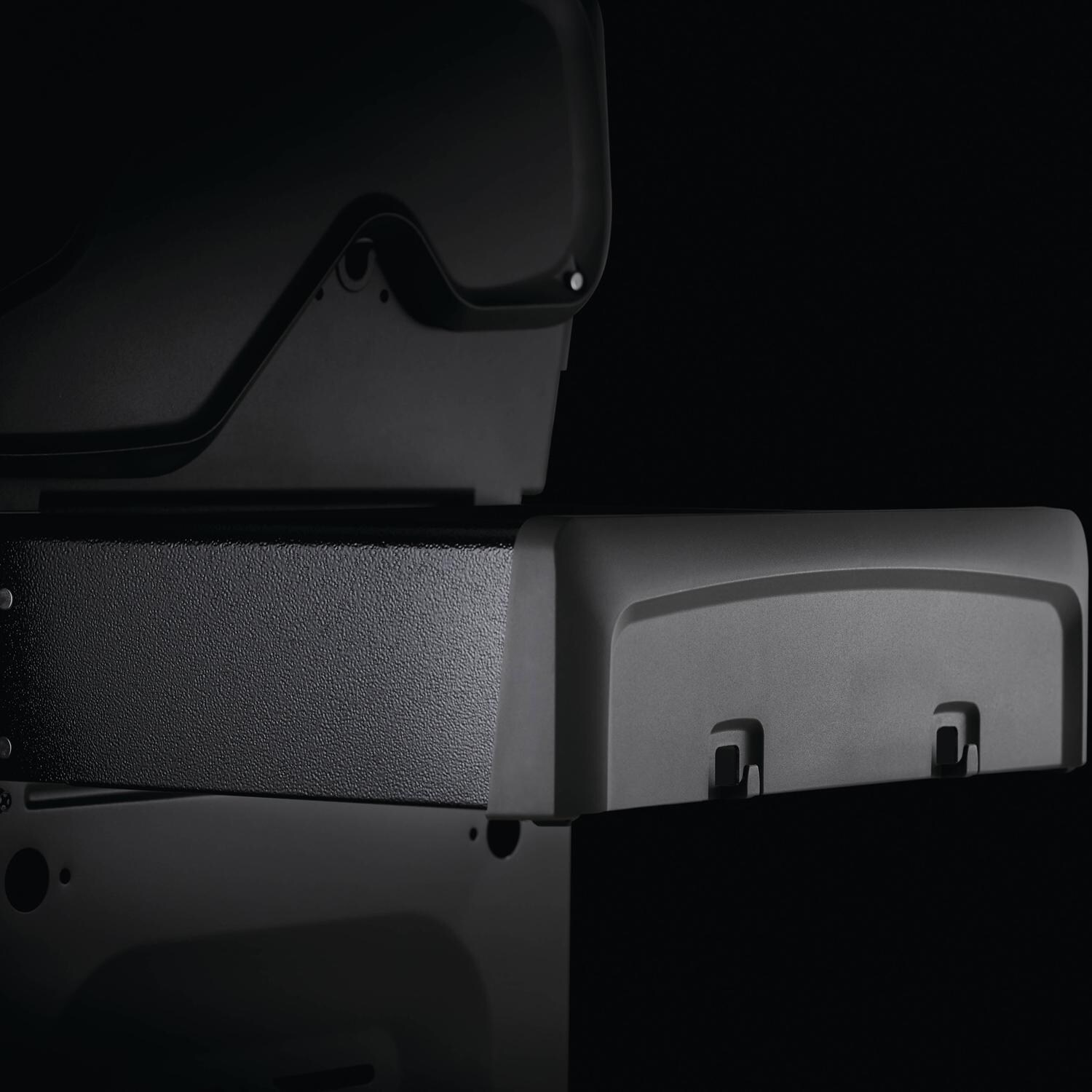 - Grill cart features, tool hooks, folding side shelves, propane tank stability ring, and easy locking caster wheels