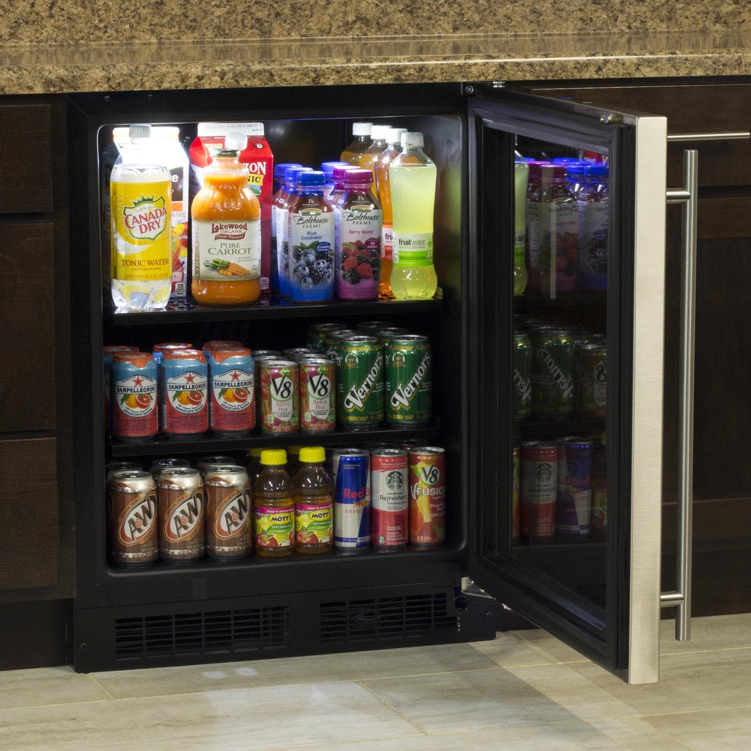 ADA and cooling needs are met with this Marvel 24-inch refrigerator with stainless steel door and handle. The Dynamic Cooling Technology in this unit uses fan-forced air for faster cooling, faster temperature recovery, and better temperature stability throughout the cabinet. The two specially designed FreshFlo cantilevered, fully adjustable, white steel shelves are smartly designed to work with this technology and allow cool air to circulate along all edges assuring even temperatures from top to bottom. The digital controls confirm the unit is operating properly and provide precise temperature management from 34F to 60F degrees. The controls can be locked to avoid unintentional changes and the display indicates the interior temperature of the unit, not the temperature at which it was set like traditional appliances, to remove any doubt that contents are cooled at the proper level. Audio and visual alarms indicate if the interior temperature falls outside proper storage parameters or if the door is left open for more than 5 minutes. The unit can be put into vacation/Sabbath mode which conserves energy when the unit is not in use. The black interior easily wipes clean and the efficient white LED lighting illuminates for better viewing. This unit has 2 cantilevered, full-width, black, steel shelves and 1 bottom storage area, and can store up to 95 12-ounce cans or 18 wine bottles. The door on this unit is reversible and can be adjusted for left or right-hinge installation.
