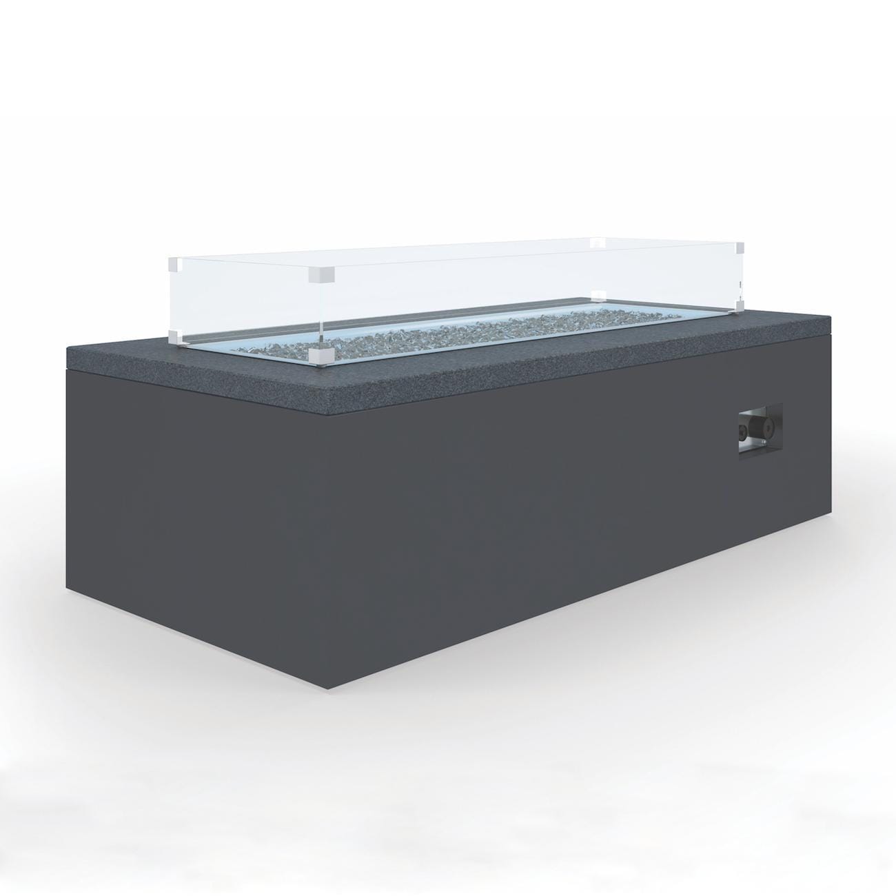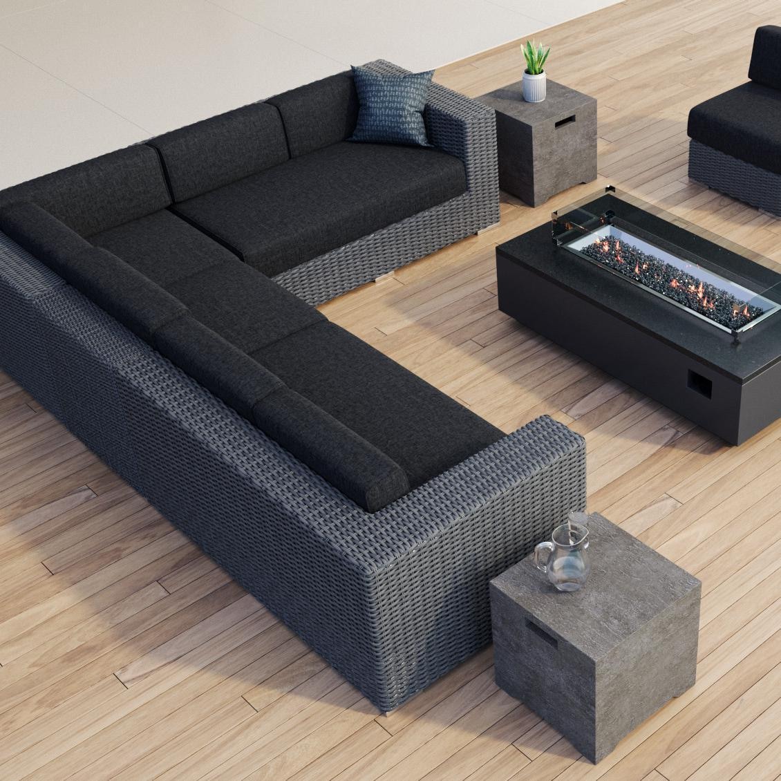 This 8 piece Emerald II Patio Fire Pit Conversation Set features a sectional sofa, 3 armless club chairs, 2 tank covers, a fire table with glass surround, and an end table. The Emerald II Collection by Sunset West offers luxurious and inviting outdoor seating with the deep plushness of indoor furniture. Contemporary lines are constructed using a fully welded powder-coated aluminum box frame that is then wrapped in hand woven HDPE resin wicker in a Steel Grey finish which mimics natural materials. This low maintenance wicker is made with durable UV-inhibitors and no fillers to prevent premature aging or cracking. A proprietary progressive springing system found in Sunset West wicker deep seating provides 3 levels of support, maximizing comfort and structural integrity. Included are weather resistant, high-resiliency foam cushions in Sunbrella Spectrum Carbon fabric. The square tank covers are made of lightweight and durable glass fiber reinforced concrete and pair perfectly with a matching fire table from Sunset West. They are finished in Graphite and serve as a discreet hiding spot for your propane tank or as an end table. The White Carrara Fire Table features a frost white aluminum cabinet with a natural White Carrara Marble top. This rectangular fire table features a stainless steel Crystal Fire burner and comes with a glass surround to protect the burner from wind. It is shipped ready for propane gas use, but comes with the necessary components to convert to natural gas. A 10 foot propane hose is included, as well as glass bead media for the burner. The burner is rated from 55,000-100,000 BTUs, is UL listed, and features a separate starter switch and flame controls. The round end table features Striated weather-resistant olefin rope in Slate expertly hand-wrapped around a fully welded powder coated aluminum hourglass frame and has a polished natural Granite top.