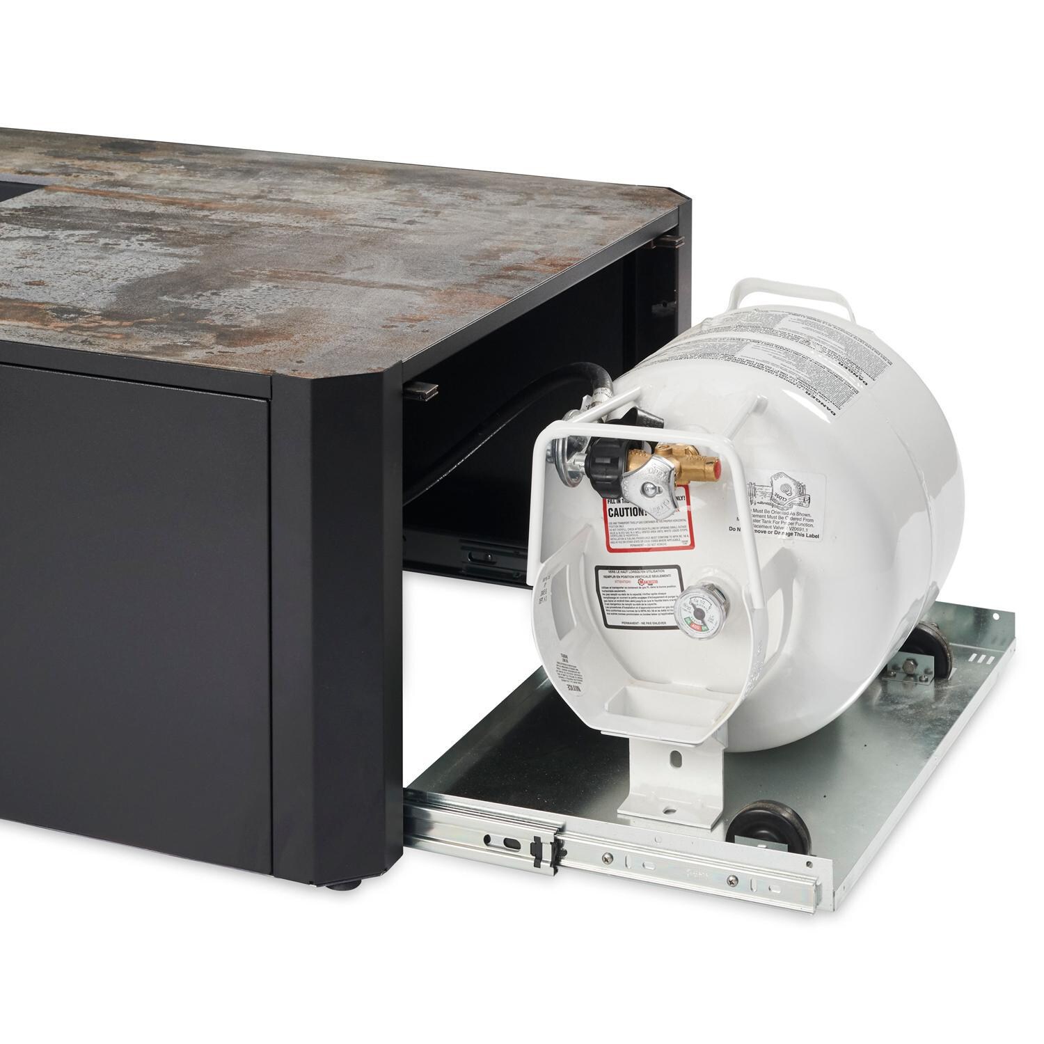The Kinney fire pit table features an ultra-modern design that is perfect for entertaining. The low-profile base meets a contemporary top to ensure your focal point is the main attraction on your patio. Extra clear glass tabletop space makes it convenient for entertaining guests. Gather everyone around the 12 X 24 inch Crystal Fire Plus burner for a cozy, relaxing time. Featuring electronic piezo controls, this fire pit lights with the push of a button and lets you easily adjust the flame height. This fire pit table is compatible with horizontal 20 lb liquid propane tanks only, it will not fit standard 20 lb liquid propane tanks.