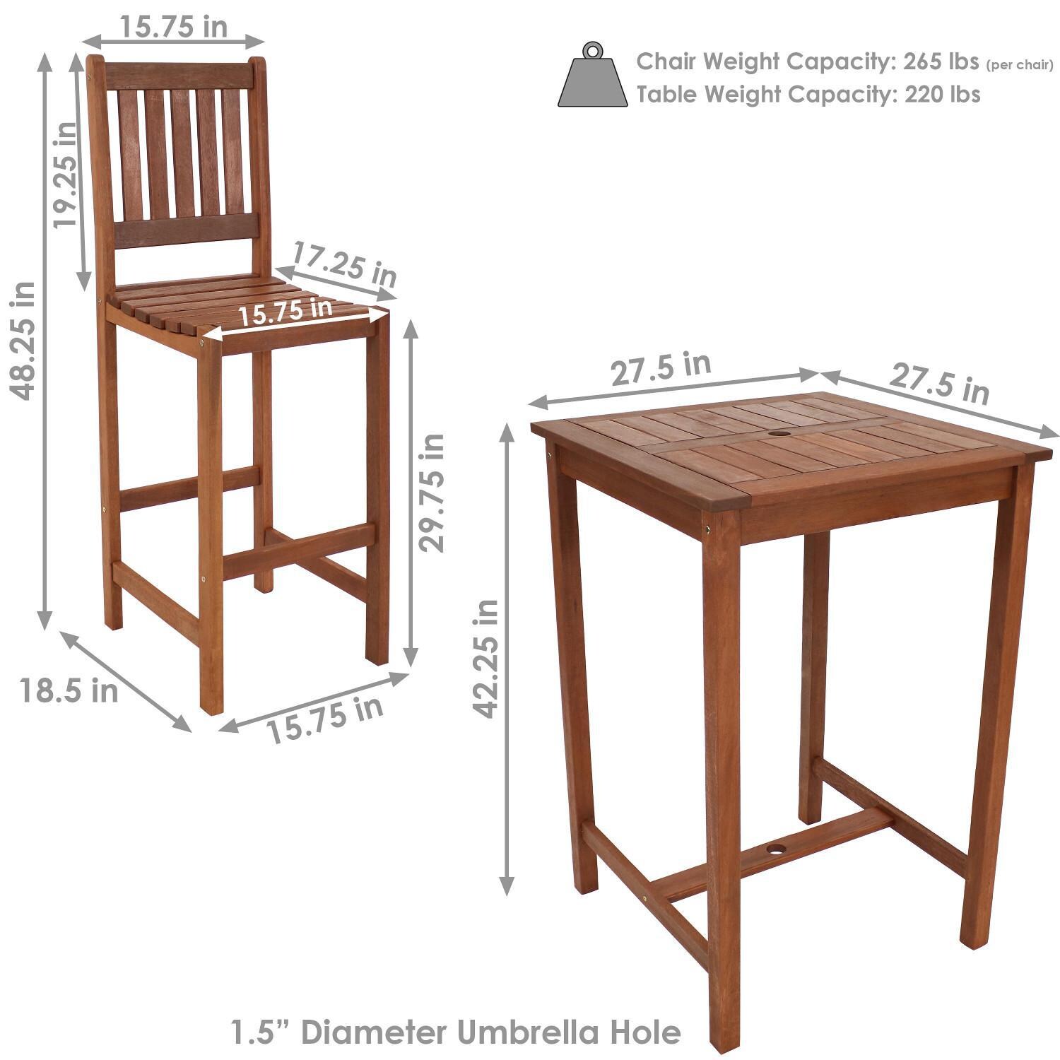 Table Dimensions: 27.5 inches wide x 27.5 inches deep x 42.25 inches tall; Tabletop thickness: 0.75 inches; Umbrella hole: 1.5-inch diameter; Weighs 33.6 lbs; Weight capacity: 220 lbs