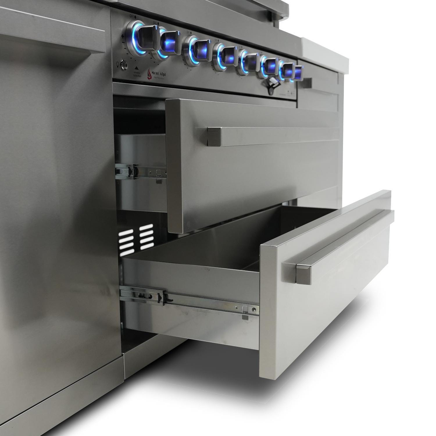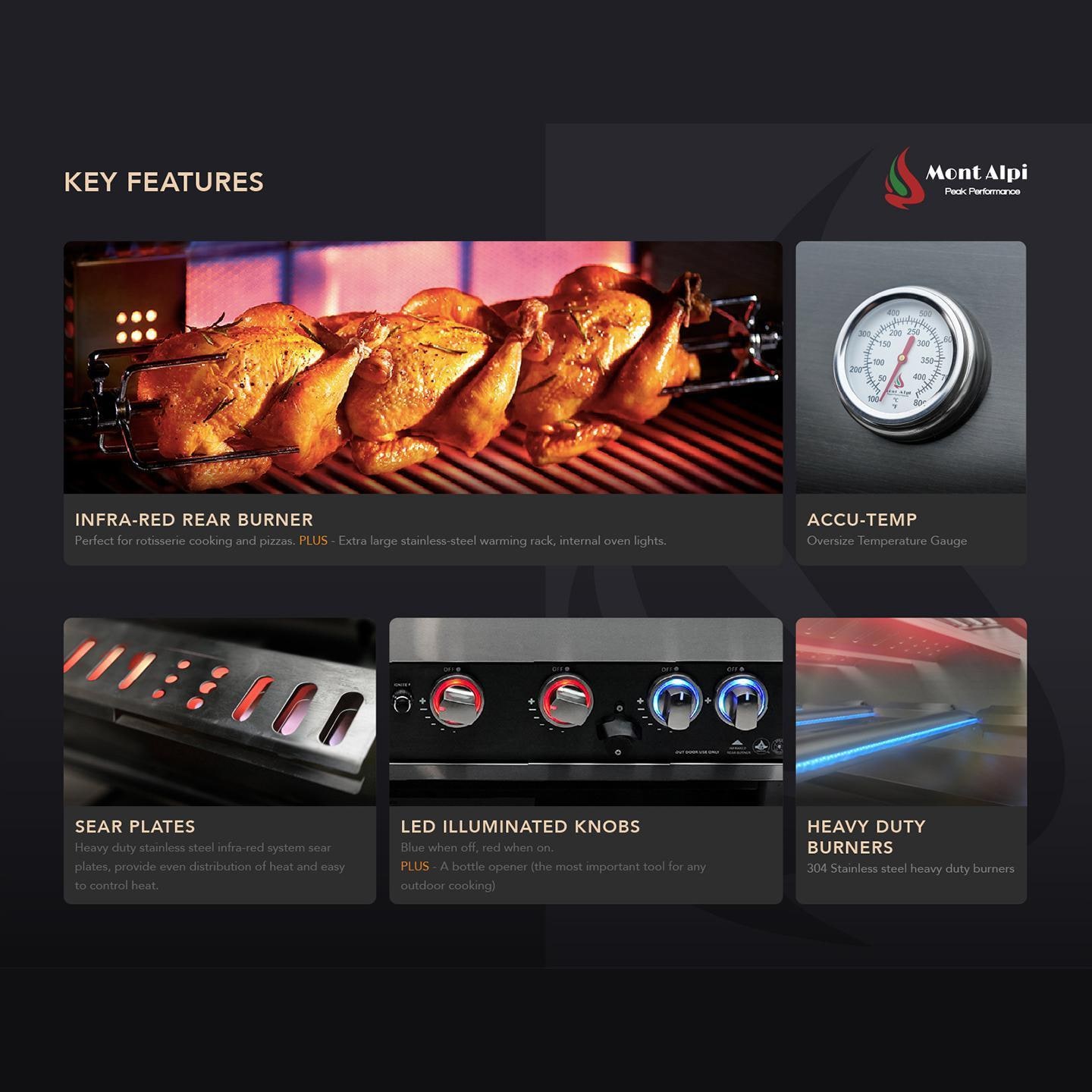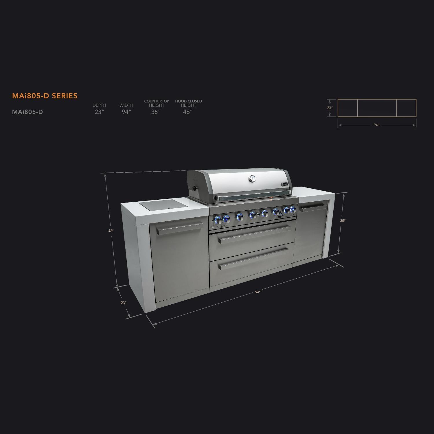 Transform your backyard into a luxurious outdoor cooking and entertainment space with the Mont Alpi Deluxe Series Outdoor Kitchen Island. Designed for serious grillers and passionate entertainers, these all-in-one grill islands deliver high-performance cooking power with elegant design and unmatched convenience. Smart features like LED control knobs (blue when off, red when on) and bright internal cooking lights provide superior visibility for nighttime grilling. A granite matching cutting board adds convenience for meal prep, while the full-size weather cover protects your investment year-round. Whether you're hosting a lively barbecue or preparing a gourmet meal under the stars, the Mont Alpi MAi805-D ensures a seamless and stylish grilling experience.