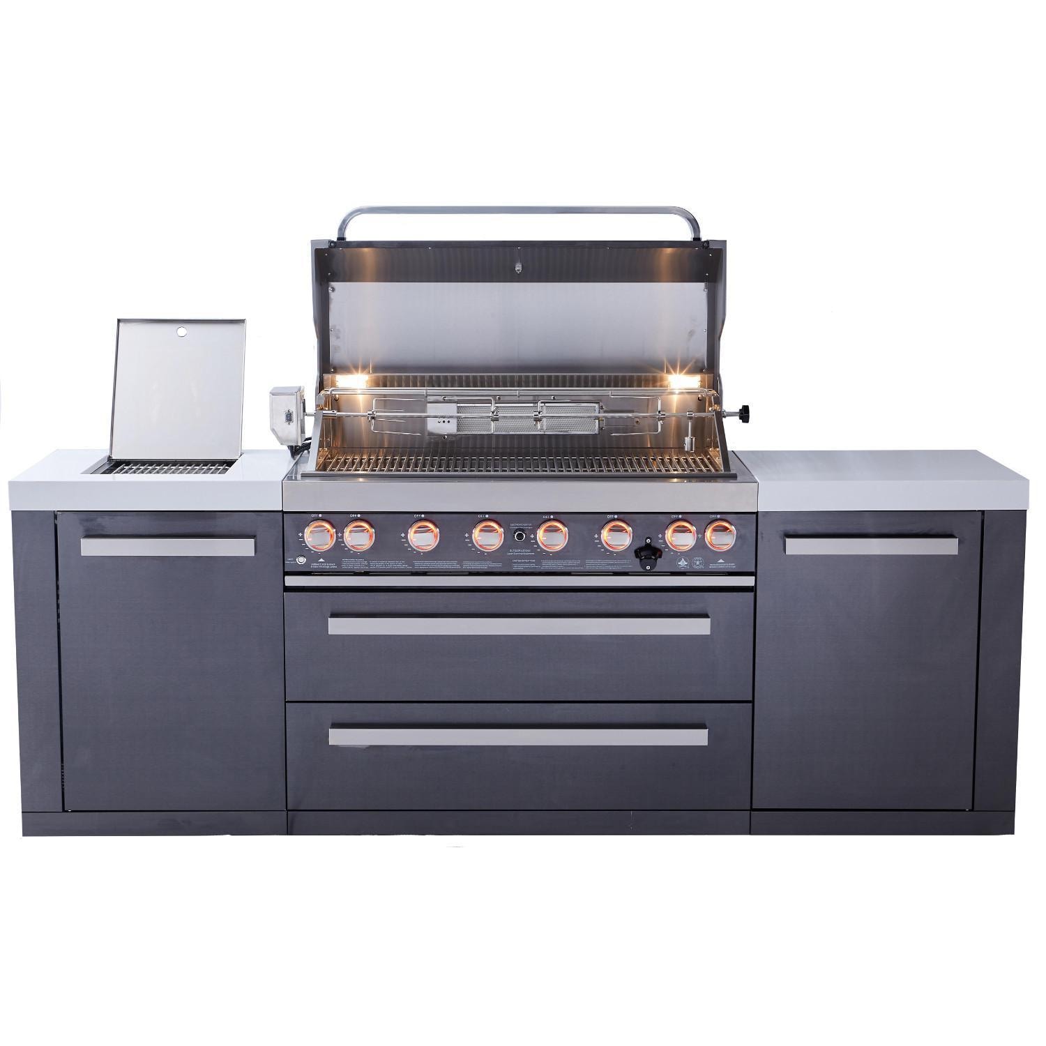 Elevate your outdoor cooking with the Mont Alpi Black Stainless Steel Series Outdoor Kitchen Island, a masterful blend of durability, luxury, and high-performance features. Built with top-tier stainless steel and luxurious granite countertops, this all-in-one island is engineered for durability, functionality, and visual appeal. With a high-performance six-burner grill featuring an infrared rear burner, and an infrared side burner. The MAi805-BSS takes outdoor entertaining to another level. Designed for grilling enthusiasts who demand excellence, this deluxe island grill offers an array of premium components that make outdoor entertaining effortless and impressive.