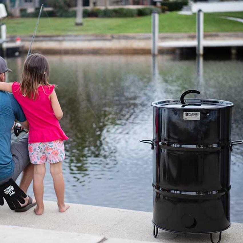 - Includes: 18.5-Inch Porcelain Coated Steel Drum, 8 Stainless Steel Hooks, 2 Steel Hanging Rods, Porcelain Coated Charcoal Basket, Standard Grill Grate, Wooden Hook Remover, 3-Point Barrel Stand, 5 oz All-Purpose Pit Rub, 5 oz Beef & Game Pit Rub