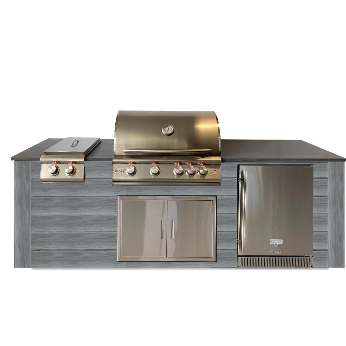This 6 ft island includes Blaze outdoor kitchen equipment and features an Alaska Gray Stone finish and Black Polished Granite countertop.