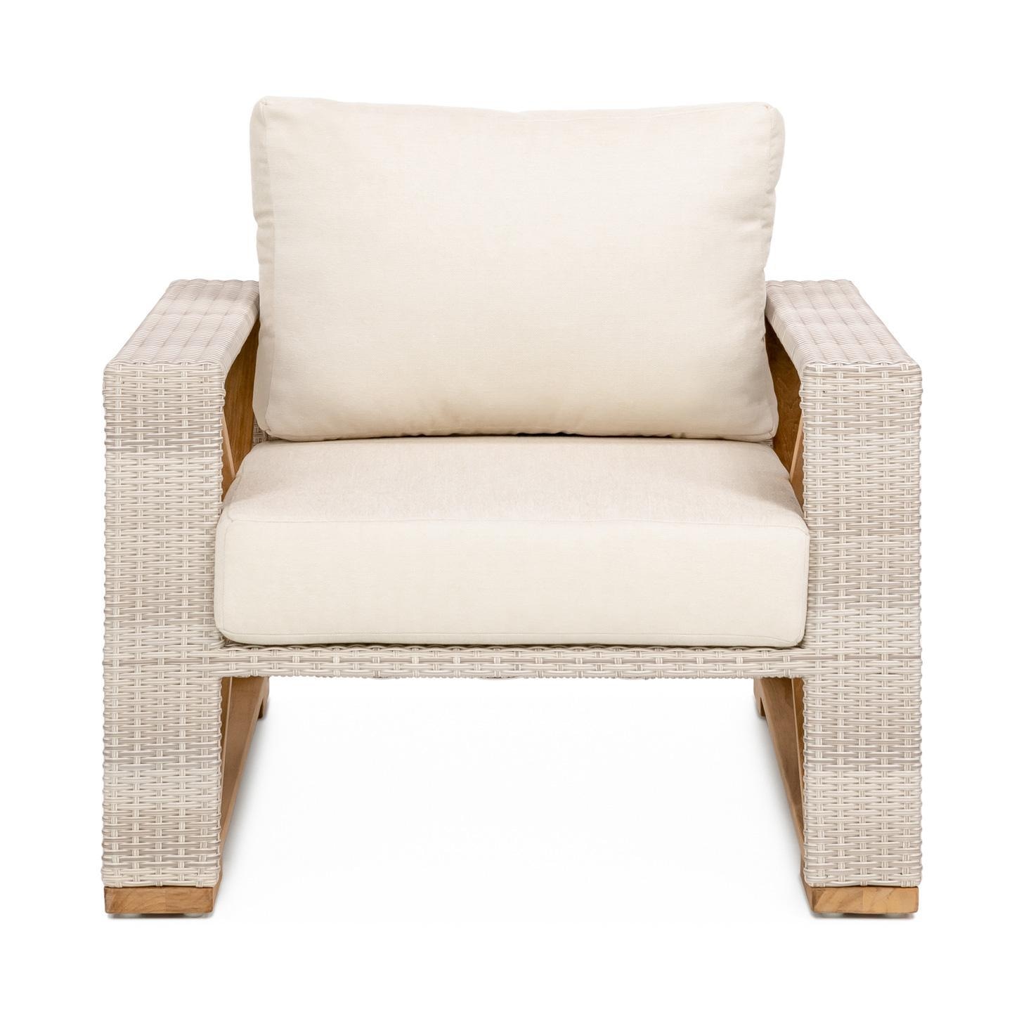 Upgrade your outdoor entertaining space with the Caicos Club Chair in Sand, a sophisticated and stylish piece that is sure to make a statement. Made from top-quality Grade A teak and resin wicker, this chair is both durable and fashionable. Pair it with our matching Caicos Loveseat and Sofa for a cohesive look, or use it to add a bold and striking accent to your existing teak furniture. With its sleek design and attention to detail, the Caicos Club Chair is a must-have for any discerning homeowner. This club chair features Natural color cushions.