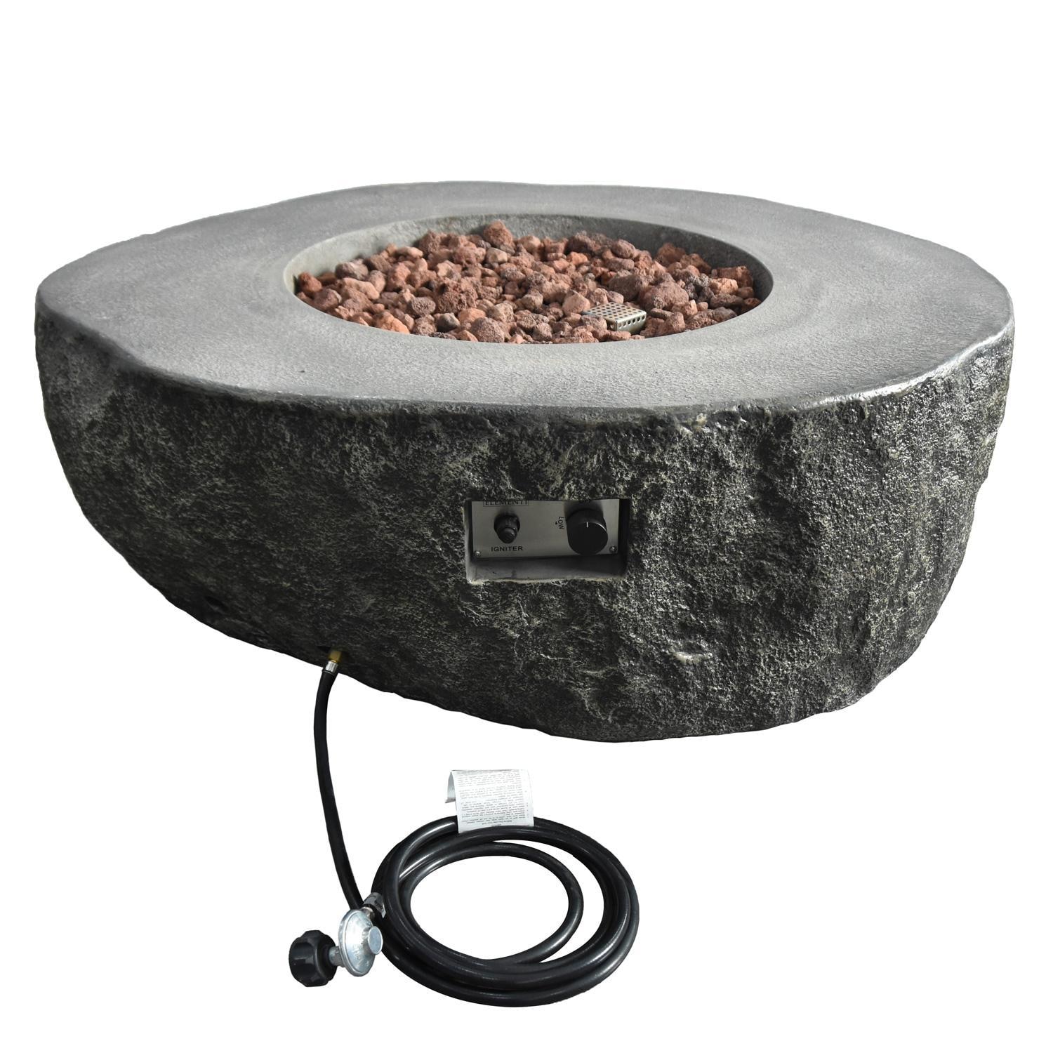 - Ideal for outdoor gatherings, the natural stone look and dancing flames elevate your patio atmosphere