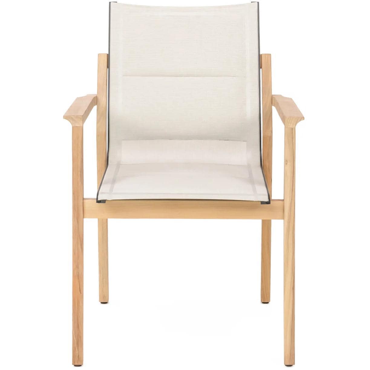 The Barbados Stacking Teak Dining Chair in White that combines both style and function- The chair features a padded upholstered sling for ultimate comfort and a natural fine-sanded teak frame for a touch of elegance. The chair's design is perfect for outdoor dining, providing both comfort and durability, the frame is constructed from natural, fine-sanded teak, known for its resistance to rot and decay, and chosen for its ability to withstand the elements such as sun exposure and heavy rain showers. The padded upholstered sling seating provides an additional layer of comfort for your guests and is available in a variety of colors to suit any aesthetic. The chair also features a stackable design, making it an excellent space-saving solution for those with limited outdoor space. This stackable feature is perfect for hotels, restaurants, and other commercial spaces, but also suitable for the everyday home user, as it saves on storage space. Elevate your outdoor dining experience with the comfort and style of this chair. With its sturdy construction and elegant design, this chair is sure to be a favorite among guests and residents alike. It's a great addition to any outdoor area like a patio, pool deck or even on a boat.
