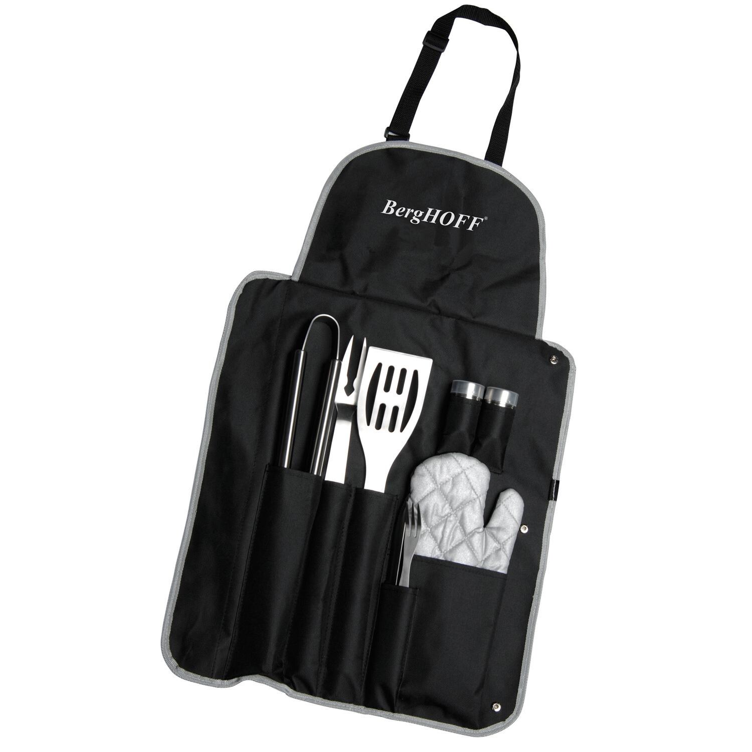 - Dishwasher safe set includes salt cellar, pepper pot, oven mitt, steak fork, steak knife, meat fork, slotted turner, tongs & apron