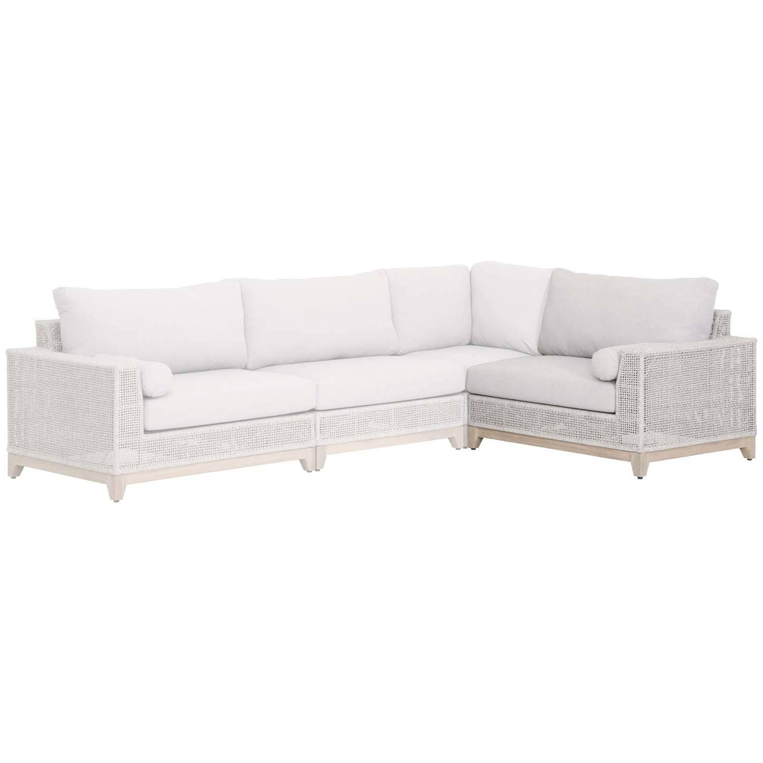 This alluring outdoor modular right-facing arm sofa will be an ideal addition to your patio or outdoor living space. It is just one component of a larger sectional outdoor sofa. You can easily connect this right-facing sofa seat with its matching modular pieces using its u-shaped clamp connecters. The modular sofa is suitable for many outdoor designs with its beachy look and transitional style. It is upholstered with a light gray olefin fabric that is weather resistant. The seat cushions are both reversible for easy cleaning, and removable for storing away in heavy weather conditions. It also includes one round bolster pillow to accessorize and complete the look. The frame is covered with an intricately woven white and taupe rope that projects a light gray hue from a distance. The exposed wood base is constructed of teak wood with gray undertones. The neutral color scheme and simple look of the modular sofa exude a clean and airy aesthetic, which is perfect for a casual and inviting ba