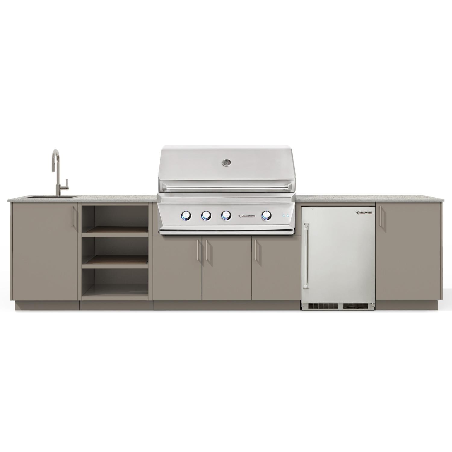 - Includes Twin Eagles TEBQ42R-CL 42 Inch Propane Grill, sink, refrigerator, heavy duty drawer, refuse & recycling module, and shelf