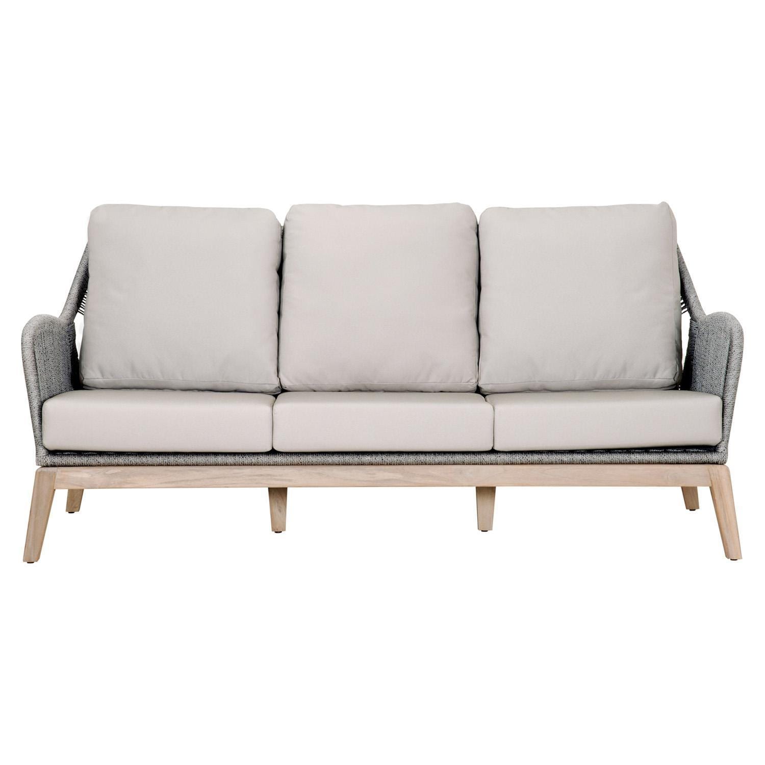 This woven outdoor sofa will add a touch of coastal style to your backyard or patio. Constructed with an aluminum frame and solid gray teak legs, this sofa is not only sturdy, but durable for outdoor use. A rich platinum colored rope is tightly woven to create a unique Peninsula Way design, while the gray teak legs feature a beautiful wood grain finish. Paired with removable all-weather seat and back cushions, the sofa provides comfort with style and will be the perfect addition to any outdoor lounging area.