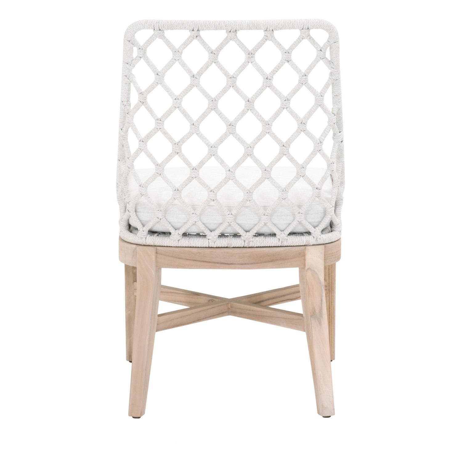 Set the tone of a casual beachy atmosphere with this rope dining chair. This dining chair is carefully crafted with an intricately woven rope designed in a lattice-like pattern. It is constructed with solid gray teak legs that are suitable for outdoor or indoor use. Its removeable seat cushion is made of an olefin fabric that is weather resistant and can sustain through light weather conditions (the cushion should be stored away in extreme weather conditions and heavy rain). Furnish your dining room or outdoor dining set with this coastal-inspired dining chairs.