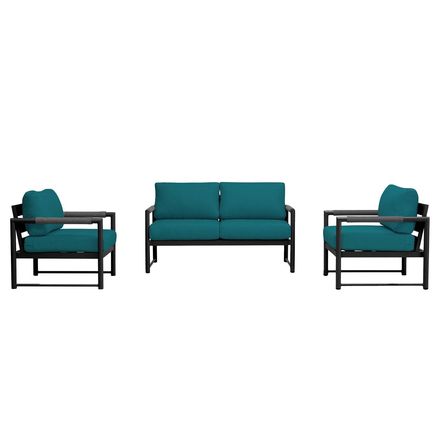 The Alto 3 Piece Loveseat Set - Black/Carbon - Spectrum Peacock Beautifully wrapped Olefin rope armrests compliment powder-coated, rust-proof aluminum frames making it both visually appealing and functional. The wrapped armrests provide padding, as well as, temperature moderation to help improve comfort during hot or cold days. Alto's scale and ergonomics provide deep seating comfort that anyone can appreciate. The cushions are made in the USA with quick-drying, Dacron and UV-treated, marine-grade PremoBond thread to create a supportive, yet comfortable seat that is meant to last throughout the seasons. This piece is offered in 9 popular Sunbrella fabric options which are fade resistant, easy to clean, and ready to ship within days of placing an order!