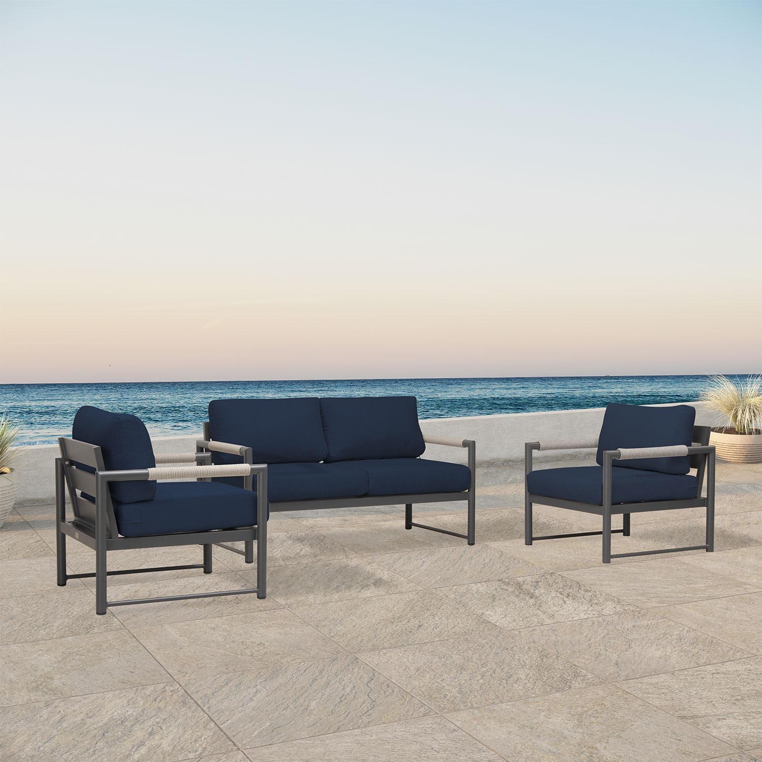 The Alto 3 Piece Loveseat Set - Slate/Pebble Gray - Spectrum Indigo Beautifully wrapped Olefin rope armrests compliment powder-coated, rust-proof aluminum frames making it both visually appealing and functional. The wrapped armrests provide padding, as well as, temperature moderation to help improve comfort during hot or cold days. Alto's scale and ergonomics provide deep seating comfort that anyone can appreciate. The cushions are made in the USA with quick-drying, Dacron and UV-treated, marine-grade PremoBond thread to create a supportive, yet comfortable seat that is meant to last throughout the seasons. This piece is offered in 9 popular Sunbrella fabric options which are fade resistant, easy to clean, and ready to ship within days of placing an order!