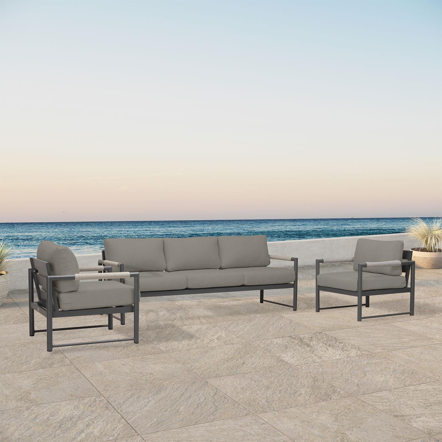 The Alto 3 Piece Sofa Club Chair Set - Slate/Pebble Gray - Canvas Charcoal Beautifully wrapped Olefin rope armrests compliment powder-coated, rust-proof aluminum frames making it both visually appealing and functional. The wrapped armrests provide padding, as well as, temperature moderation to help improve comfort during hot or cold days. Alto's scale and ergonomics provide deep seating comfort that anyone can appreciate. The cushions are made in the USA with quick-drying, Dacron and UV-treated, marine-grade PremoBond thread to create a supportive, yet comfortable seat that is meant to last throughout the seasons. This piece is offered in 9 popular Sunbrella fabric options which are fade resistant, easy to clean, and ready to ship within days of placing an order!
