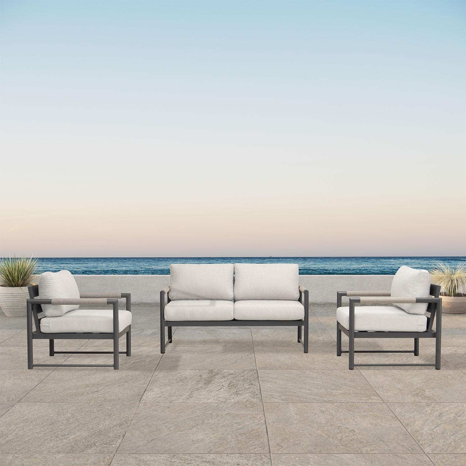The Alto 3 Piece Sofa Loveseat Set - Slate/Pebble Gray - Cast Silver Beautifully wrapped Olefin rope armrests compliment powder-coated, rust-proof aluminum frames making it both visually appealing and functional. The wrapped armrests provide padding, as well as, temperature moderation to help improve comfort during hot or cold days. Alto's scale and ergonomics provide deep seating comfort that anyone can appreciate. The cushions are made in the USA with quick-drying, Dacron and UV-treated, marine-grade PremoBond thread to create a supportive, yet comfortable seat that is meant to last throughout the seasons. This piece is offered in 9 popular Sunbrella fabric options which are fade resistant, easy to clean, and ready to ship within days of placing an order!