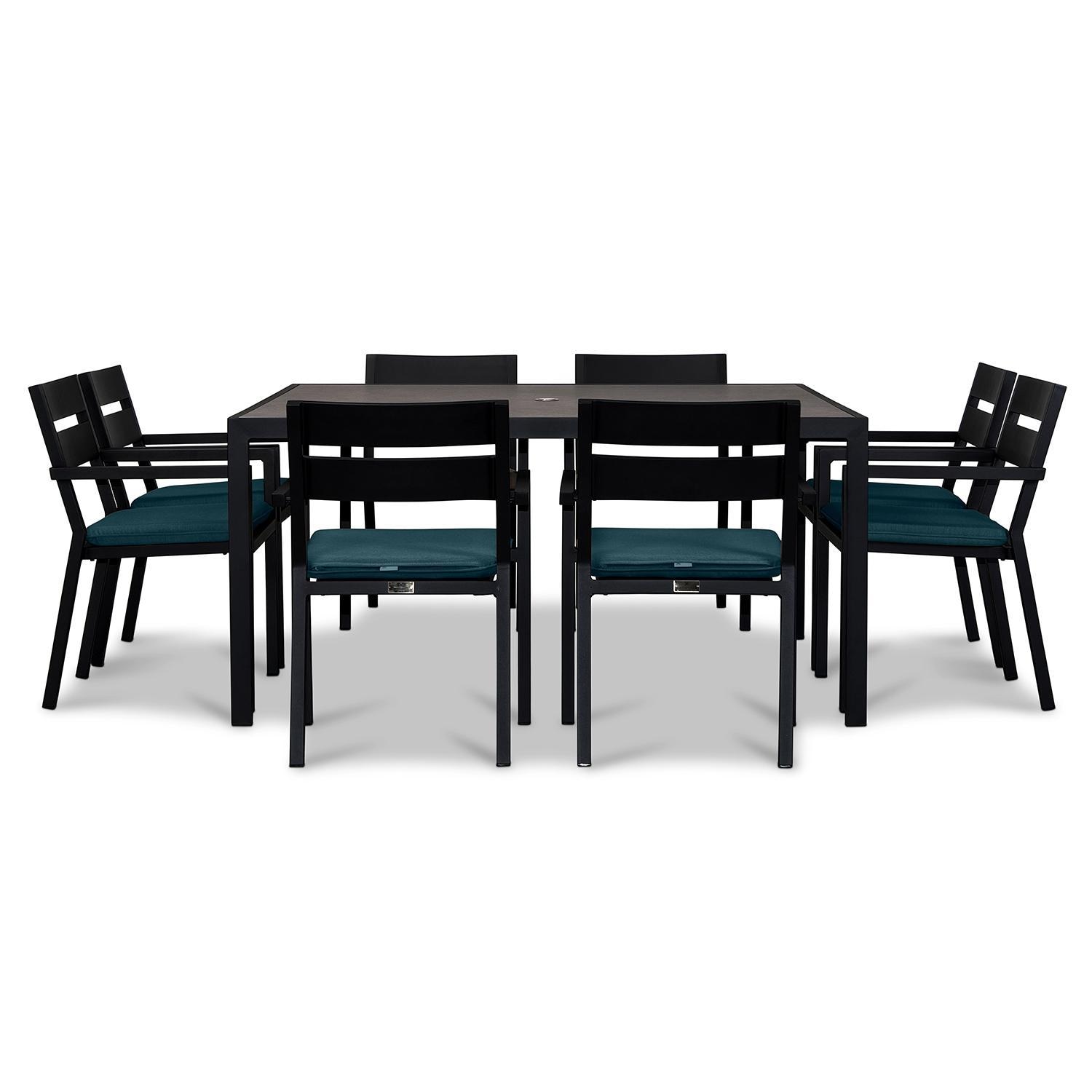 The Calm Bay 8 Seat Square Dining Set - Black - Cast Lagoon will bring refinement and relaxation to your favorite outdoor space. Enjoy the simple elegance of its plush cushions, gentle angles and minimalist design that is perfect for patios - large and small. Its fully-welded aluminum frames are treated with a powder-coated finish to ensure lasting performance across the seasons. Optional cushions are made in the USA with quick-drying, Dacron and UV-treated, marine-grade PremoBond thread to create a supportive, yet comfortable seat that is meant to last throughout the seasons. All cushions are constructed from Sunbrella performance fabrics, which carry a 5-year fade warranty. This piece is offered in 9 popular Sunbrella fabric options which are fade resistant, easy to clean, and ready to ship within days of placing an order! The chairs are paired with the Staple Table, which boasts modern lines and durable, low-maintenance materials. Its unique, tempered glass top features a scratch-proof ceramic coating, which will make hosting easier in high-traffic settings.
