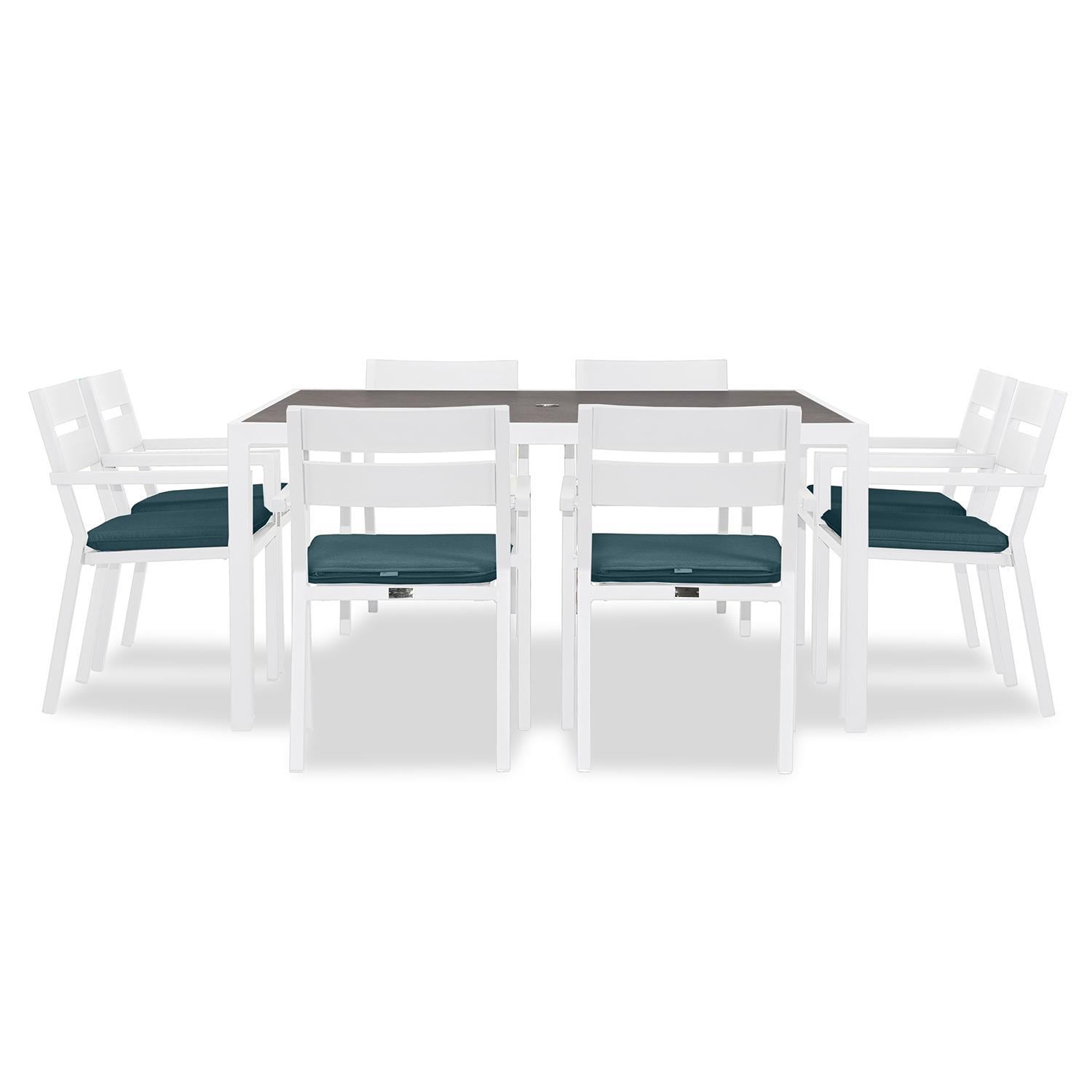 The Calm Bay 8 Seat Square Dining Set - White - Cast Lagoon will bring refinement and relaxation to your favorite outdoor space. Enjoy the simple elegance of its plush cushions, gentle angles and minimalist design that is perfect for patios - large and small. Its fully-welded aluminum frames are treated with a powder-coated finish to ensure lasting performance across the seasons. Optional cushions are made in the USA with quick-drying, Dacron and UV-treated, marine-grade PremoBond thread to create a supportive, yet comfortable seat that is meant to last throughout the seasons. All cushions are constructed from Sunbrella performance fabrics, which carry a 5-year fade warranty. This piece is offered in 9 popular Sunbrella fabric options which are fade resistant, easy to clean, and ready to ship within days of placing an order! The chairs are paired with the Staple Table, which boasts modern lines and durable, low-maintenance materials. Its unique, tempered glass top features a scratch-proof ceramic coating, which will make hosting easier in high-traffic settings.