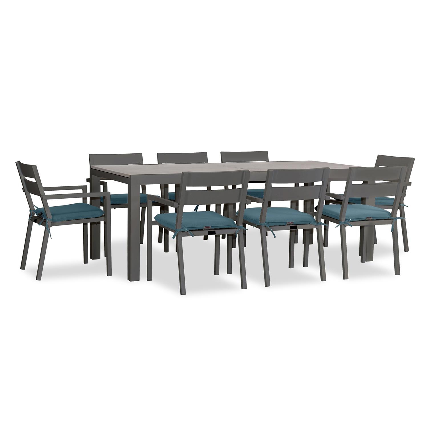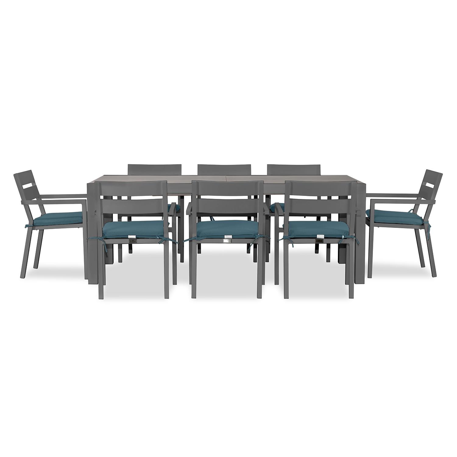 The Calm Bay 8 Seat Extendable Dining Set - Slate/Barnwood - Cast Lagoon will bring refinement and relaxation to your favorite outdoor space. Enjoy the simple elegance of its plush cushions, gentle angles and minimalist design that is perfect for patios - large and small. Its fully-welded aluminum frames are treated with a powder-coated finish to ensure lasting performance across the seasons. Optional cushions are made in the USA with quick-drying, Dacron and UV-treated, marine-grade PremoBond thread to create a supportive, yet comfortable seat that is meant to last throughout the seasons. All cushions are constructed from Sunbrella performance fabrics, which carry a 5-year fade warranty. This piece is offered in 9 popular Sunbrella fabric options which are fade resistant, easy to clean, and ready to ship within days of placing an order! The chairs are paired with the Spread Table, which boasts modern lines and durable, low-maintenance materials. The table features one extension leaf that rotates into place during use or for easy storage under the table when not in use, and can easily be operated by one person. This patio dining table seats up to 12 when extended and 8 when not extended making it a flexible outdoor dining table for entertaining.