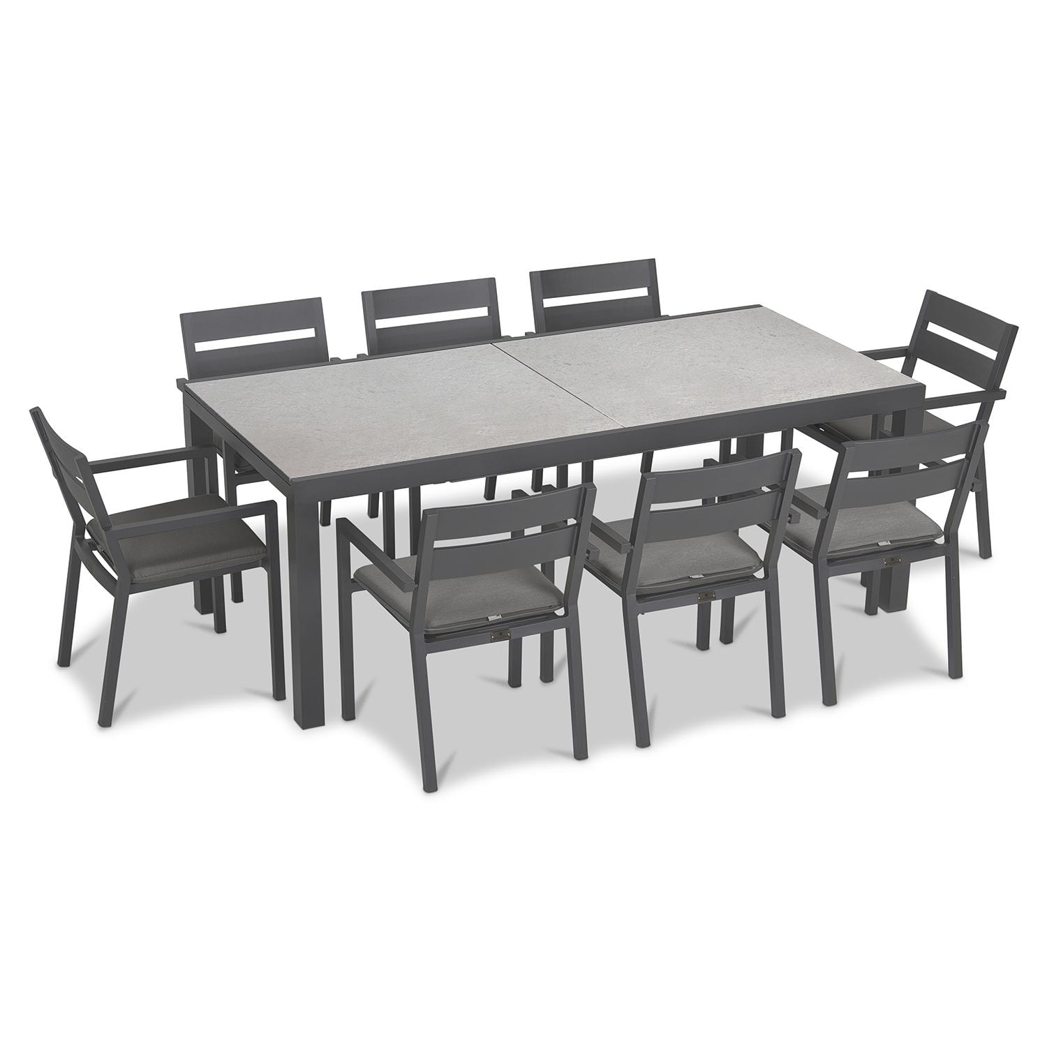 The Calm Bay 8 Seat Extendable Dining Set - Slate/Concrete - Canvas Charcoal will bring refinement and relaxation to your favorite outdoor space. Enjoy the simple elegance of its plush cushions, gentle angles and minimalist design that is perfect for patios - large and small. Its fully-welded aluminum frames are treated with a powder-coated finish to ensure lasting performance across the seasons. Optional cushions are made in the USA with quick-drying, Dacron and UV-treated, marine-grade PremoBond thread to create a supportive, yet comfortable seat that is meant to last throughout the seasons. All cushions are constructed from Sunbrella performance fabrics, which carry a 5-year fade warranty. This piece is offered in 9 popular Sunbrella fabric options which are fade resistant, easy to clean, and ready to ship within days of placing an order! The chairs are paired with the Spread Table, which boasts modern lines and durable, low-maintenance materials. The table features one extension leaf that rotates into place during use or for easy storage under the table when not in use, and can easily be operated by one person. This patio dining table seats up to 12 when extended and 8 when not extended making it a flexible outdoor dining table for entertaining.