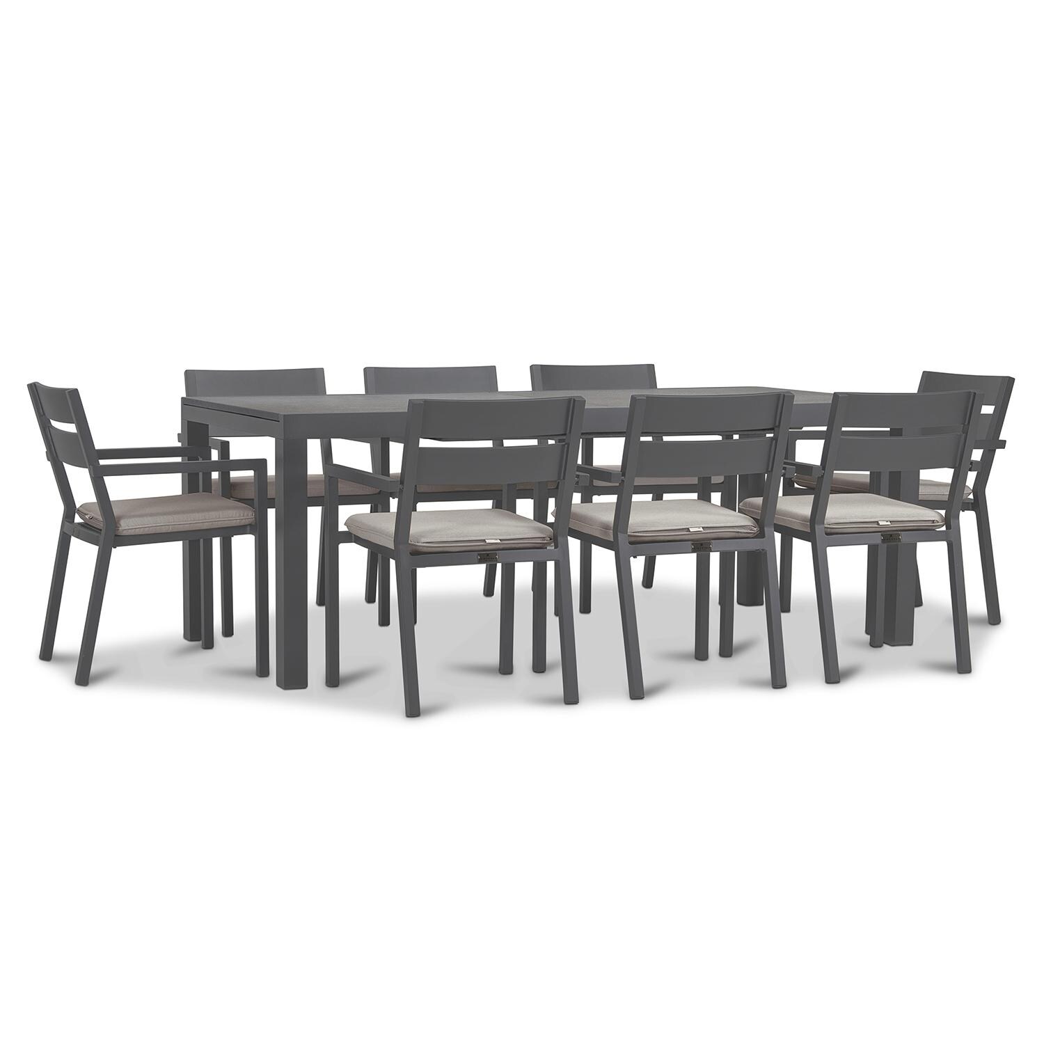 The Calm Bay 8 Seat Extendable Dining Set - Slate/Concrete - Cast Silver will bring refinement and relaxation to your favorite outdoor space. Enjoy the simple elegance of its plush cushions, gentle angles and minimalist design that is perfect for patios - large and small. Its fully-welded aluminum frames are treated with a powder-coated finish to ensure lasting performance across the seasons. Optional cushions are made in the USA with quick-drying, Dacron and UV-treated, marine-grade PremoBond thread to create a supportive, yet comfortable seat that is meant to last throughout the seasons. All cushions are constructed from Sunbrella performance fabrics, which carry a 5-year fade warranty. This piece is offered in 9 popular Sunbrella fabric options which are fade resistant, easy to clean, and ready to ship within days of placing an order! The chairs are paired with the Spread Table, which boasts modern lines and durable, low-maintenance materials. The table features one extension leaf that rotates into place during use or for easy storage under the table when not in use, and can easily be operated by one person. This patio dining table seats up to 12 when extended and 8 when not extended making it a flexible outdoor dining table for entertaining.
