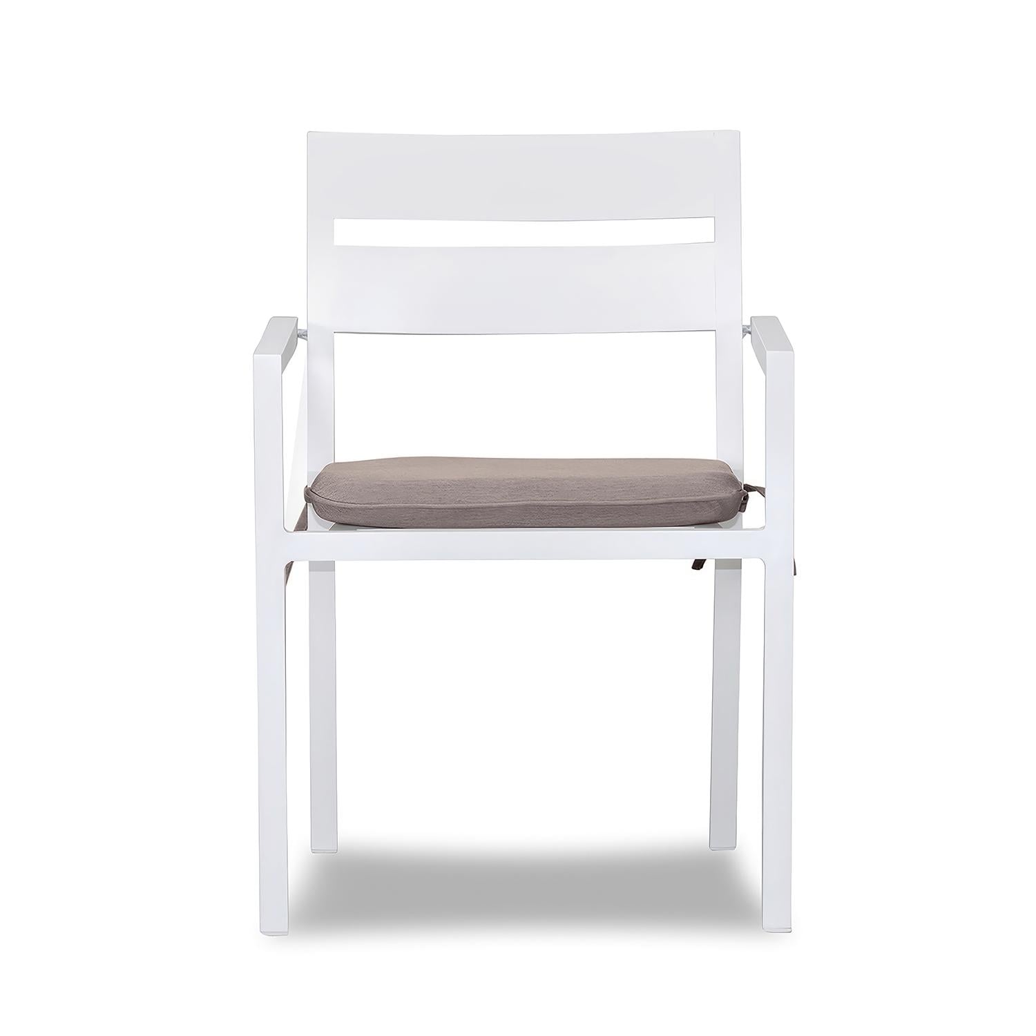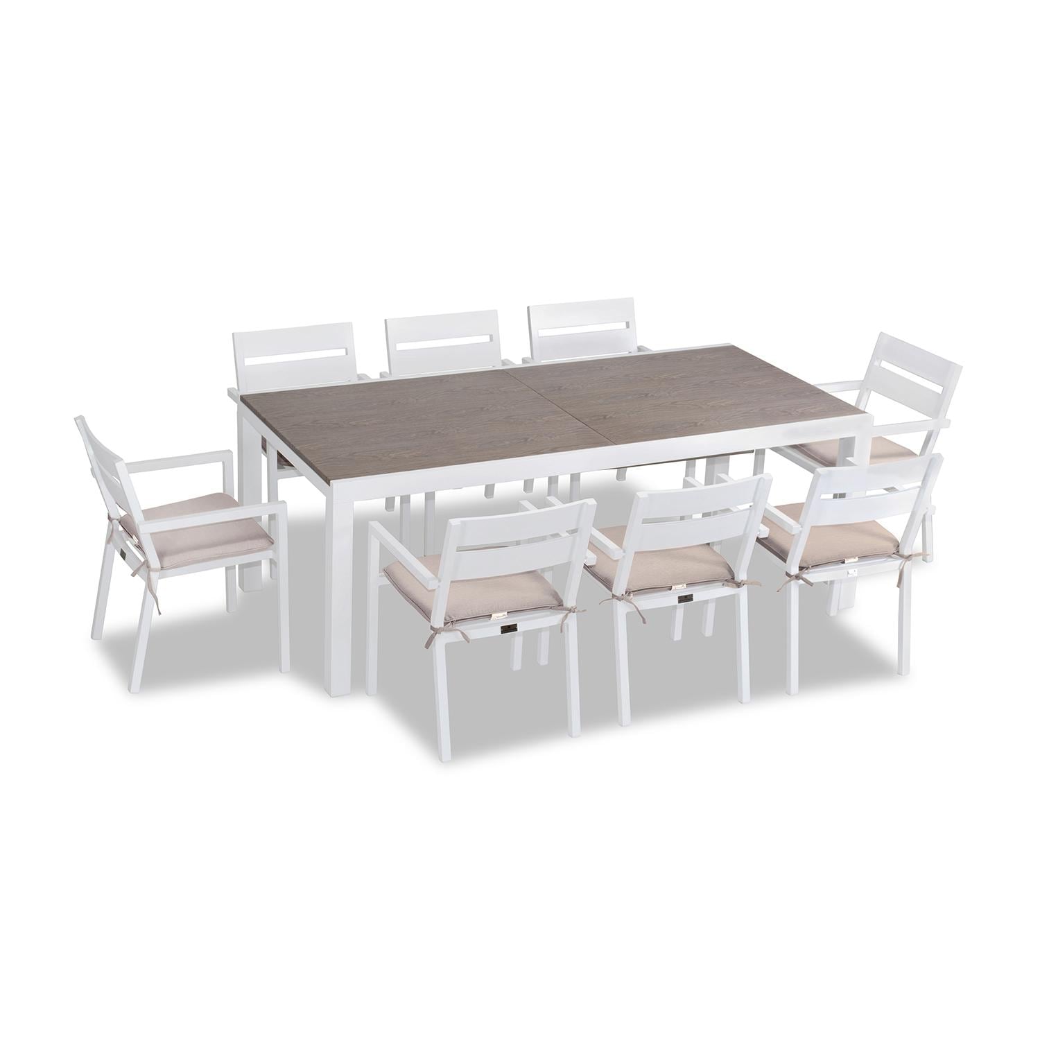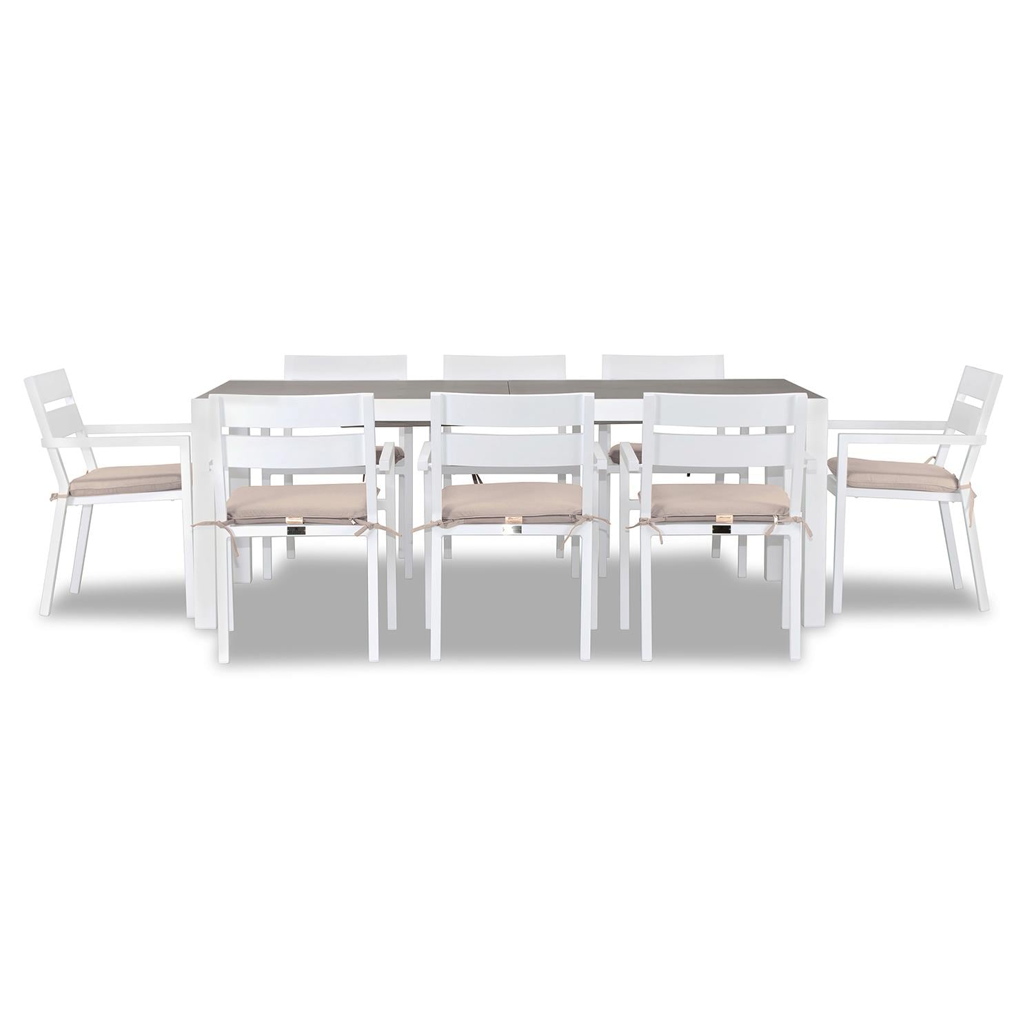 The Calm Bay 8 Seat Extendable Dining Set - White/Barnwood - Canvas Flax will bring refinement and relaxation to your favorite outdoor space. Enjoy the simple elegance of its plush cushions, gentle angles and minimalist design that is perfect for patios - large and small. Its fully-welded aluminum frames are treated with a powder-coated finish to ensure lasting performance across the seasons. Optional cushions are made in the USA with quick-drying, Dacron and UV-treated, marine-grade PremoBond thread to create a supportive, yet comfortable seat that is meant to last throughout the seasons. All cushions are constructed from Sunbrella performance fabrics, which carry a 5-year fade warranty. This piece is offered in 9 popular Sunbrella fabric options which are fade resistant, easy to clean, and ready to ship within days of placing an order! The chairs are paired with the Spread Table, which boasts modern lines and durable, low-maintenance materials. The table features one extension leaf that rotates into place during use or for easy storage under the table when not in use, and can easily be operated by one person. This patio dining table seats up to 12 when extended and 8 when not extended making it a flexible outdoor dining table for entertaining.
