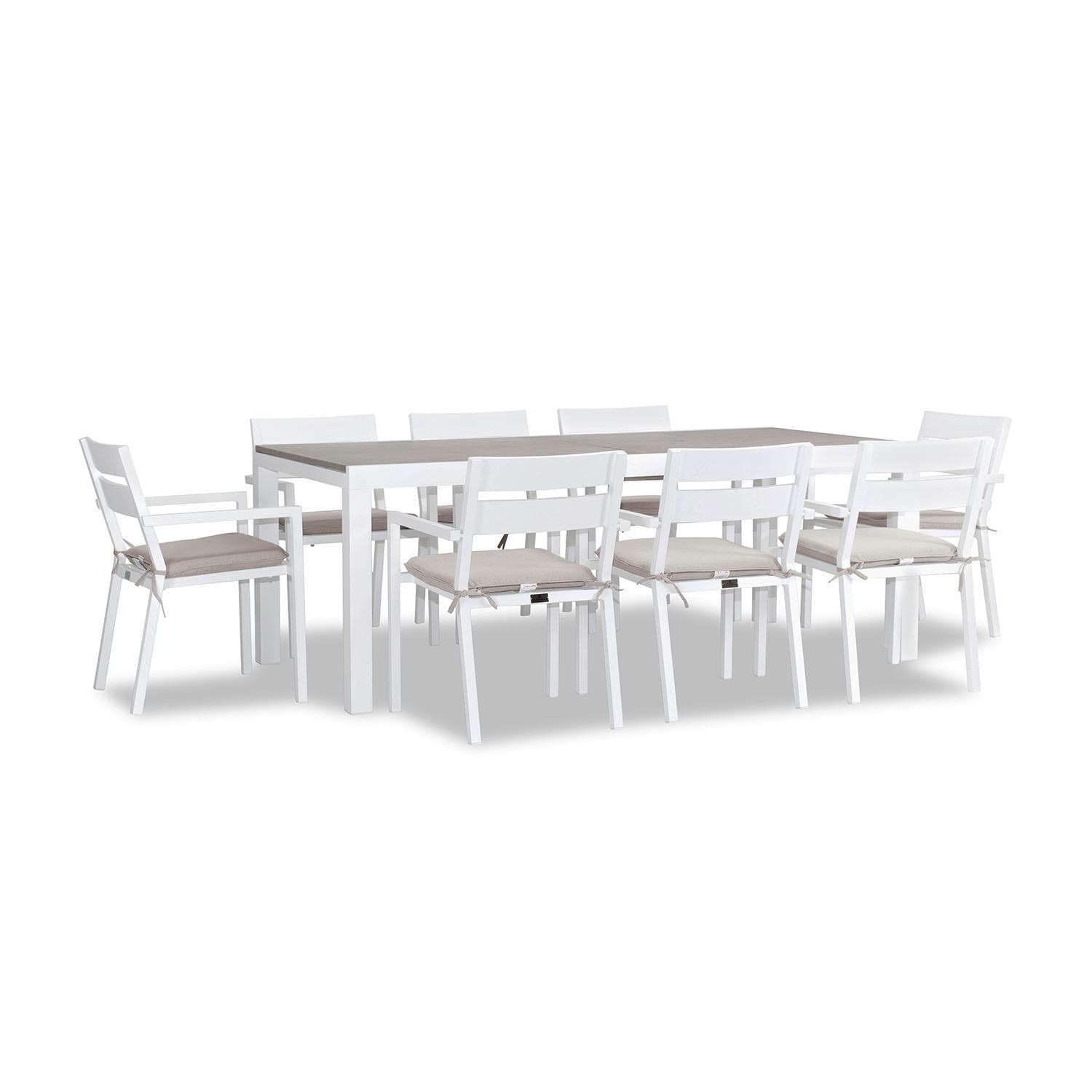 The Calm Bay 8 Seat Extendable Dining Set - White/Barnwood - Cast Silver will bring refinement and relaxation to your favorite outdoor space. Enjoy the simple elegance of its plush cushions, gentle angles and minimalist design that is perfect for patios - large and small. Its fully-welded aluminum frames are treated with a powder-coated finish to ensure lasting performance across the seasons. Optional cushions are made in the USA with quick-drying, Dacron and UV-treated, marine-grade PremoBond thread to create a supportive, yet comfortable seat that is meant to last throughout the seasons. All cushions are constructed from Sunbrella performance fabrics, which carry a 5-year fade warranty. This piece is offered in 9 popular Sunbrella fabric options which are fade resistant, easy to clean, and ready to ship within days of placing an order! The chairs are paired with the Spread Table, which boasts modern lines and durable, low-maintenance materials. The table features one extension leaf that rotates into place during use or for easy storage under the table when not in use, and can easily be operated by one person. This patio dining table seats up to 12 when extended and 8 when not extended making it a flexible outdoor dining table for entertaining.