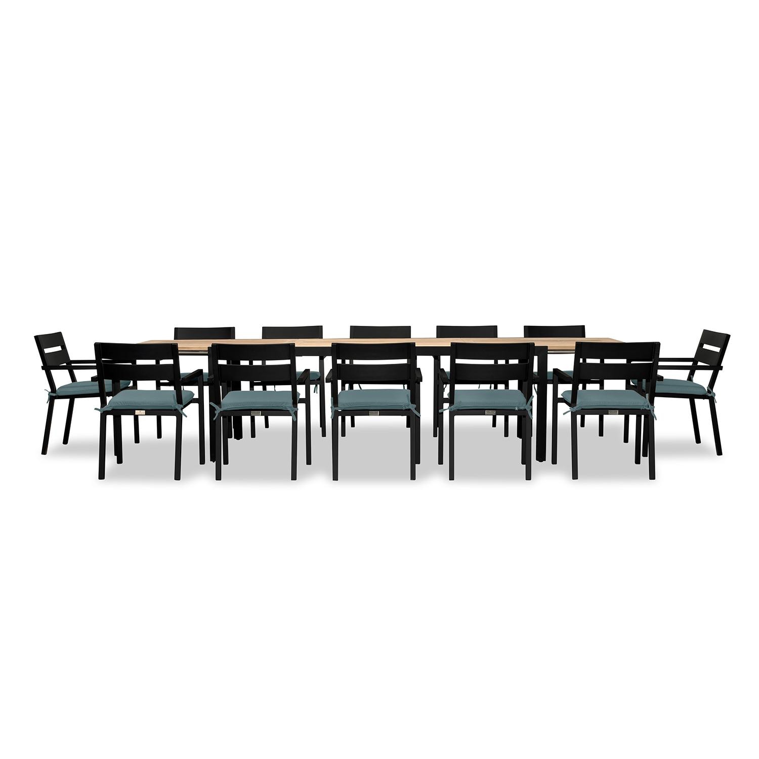 The Calm Bay Communal 12 Seat Extendable Reclaimed Teak Dining Set - Cast Lagoon will bring refinement and relaxation to your favorite outdoor space. Enjoy the simple elegance of its plush cushions, gentle angles and minimalist design that is perfect for patios - large and small. Its fully-welded aluminum frames are treated with a powder-coated finish to ensure lasting performance across the seasons. Optional cushions are made in the USA with quick-drying, Dacron and UV-treated, marine-grade PremoBond thread to create a supportive, yet comfortable seat that is meant to last throughout the seasons. All cushions are constructed from Sunbrella performance fabrics, which carry a 5-year fade warranty. This piece is offered in 9 popular Sunbrella fabric options which are fade resistant, easy to clean, and ready to ship within days of placing an order! The Communal table was repurposed from 100% FSC Certified ®, Indonesian reclaimed teak and paired with a sleek black aluminum frame. The table features one extension leaf that rotates into place during use or for easy storage under the table when not in use, and can easily be operated by one person. This patio dining table seats up to 12 when extended and 8 when not extended making it a flexible outdoor dining table for entertaining.