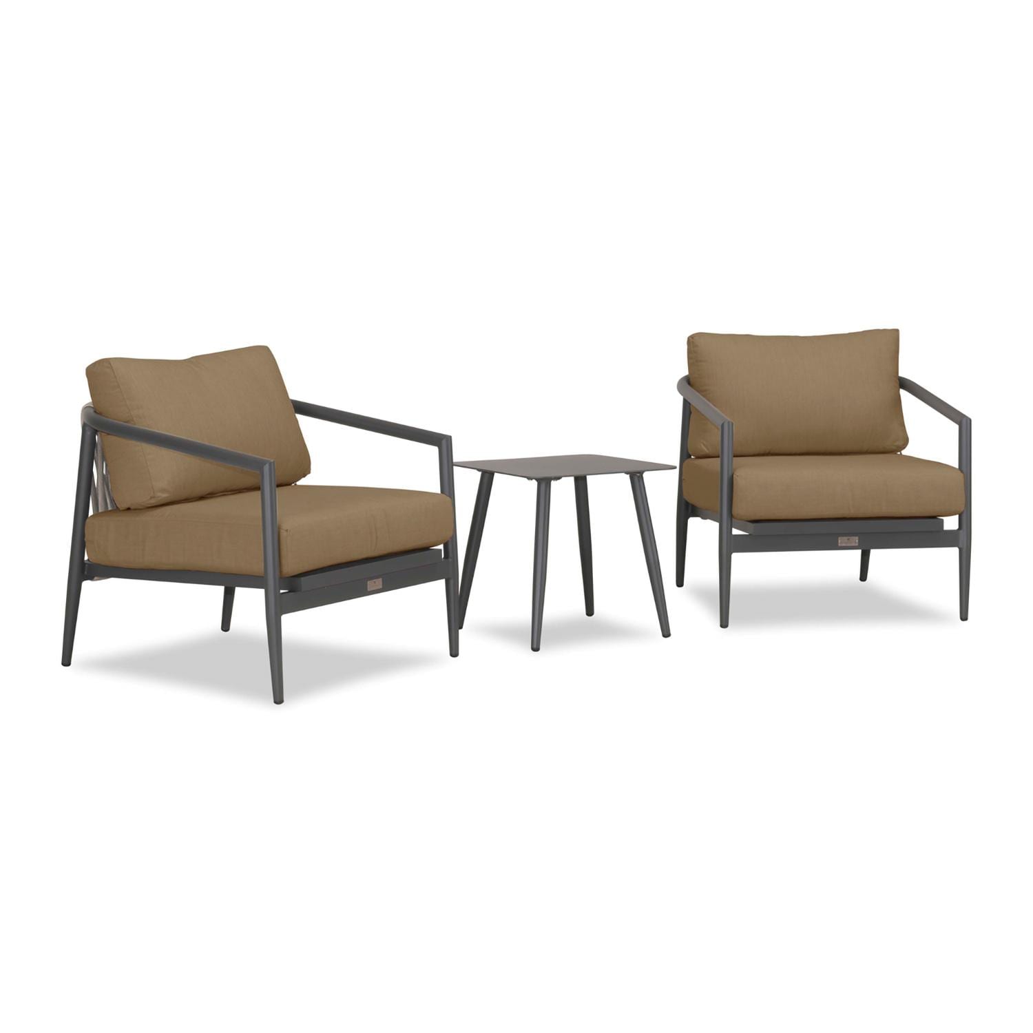 The Midnight Cove 3 Piece Club Chair Set in a Slate finish with Heather Beige cushions is an imagined Mid Century Modern design brought to life with Pebble Gray Olefin rope. Accented with tapered legs, subtle curves and an intertwining roped back for flair, the silhouette of the Midnight Cove collection is a sophisticated work of art. Midnight Cove was efficiently designed to be both compact in its footprint while still offering full sized deep seating comfort. Its fully-welded aluminum frames are treated with a powder-coated finish to ensure lasting performance across the seasons. Beautiful Pebble Gray Olefin rope compliment the frames making it both visually appealing and durable in all types of climates. The cushions are made in the USA with quick-drying, Dacron and UV-treated, marine-grade PremoBond thread to create a supportive, yet comfortable seat that is meant to last throughout the seasons. All cushions are constructed from Sunbrella performance fabrics, which carry a 5-year fade warranty. This piece is offered in 9 popular Sunbrella fabric options which are fade resistant, easy to clean, and ready to ship within days of placing an order! The sleek, aluminum table perfectly compliments the rest of the deep seating set!