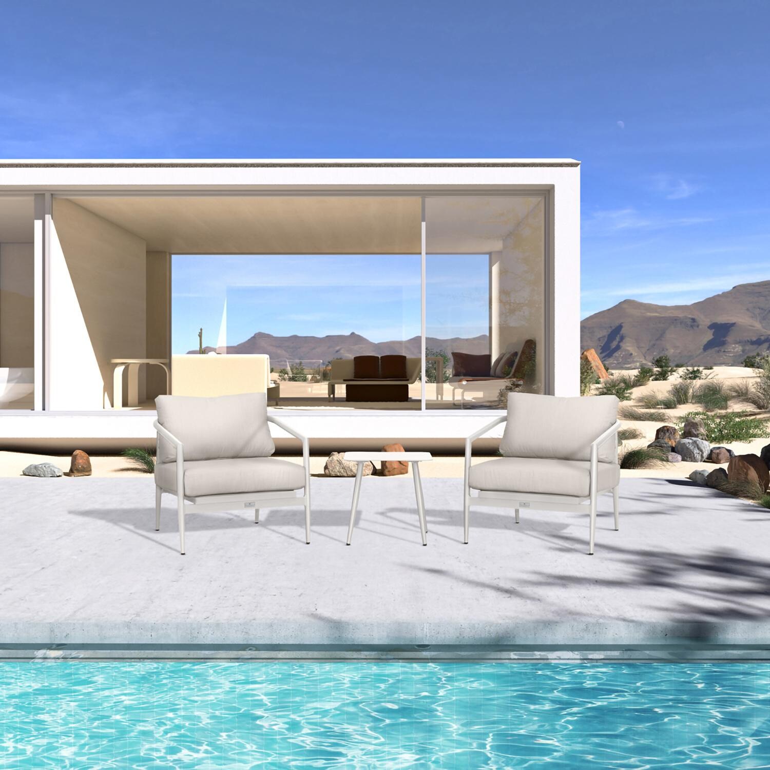 The Midnight Cove 3 Piece Club Chair Set in an Urban Stone finish with Spectrum Indigo cushions is an imagined Mid Century Modern design brought to life with Carrera Olefin rope. Accented with tapered legs, subtle curves and an intertwining roped back for flair, the silhouette of the Midnight Cove collection is a sophisticated work of art. Midnight Cove was efficiently designed to be both compact in its footprint while still offering full sized deep seating comfort. Its fully-welded aluminum frames are treated with a powder-coated finish to ensure lasting performance across the seasons. Beautiful Carrera Olefin rope compliment the frames making it both visually appealing and durable in all types of climates. The cushions are made in the USA with quick-drying, Dacron and UV-treated, marine-grade PremoBond thread to create a supportive, yet comfortable seat that is meant to last throughout the seasons. All cushions are constructed from Sunbrella performance fabrics, which carry a 5-year fade warranty. This piece is offered in 9 popular Sunbrella fabric options which are fade resistant, easy to clean, and ready to ship within days of placing an order! The sleek, aluminum table perfectly compliments the rest of the deep seating set!
