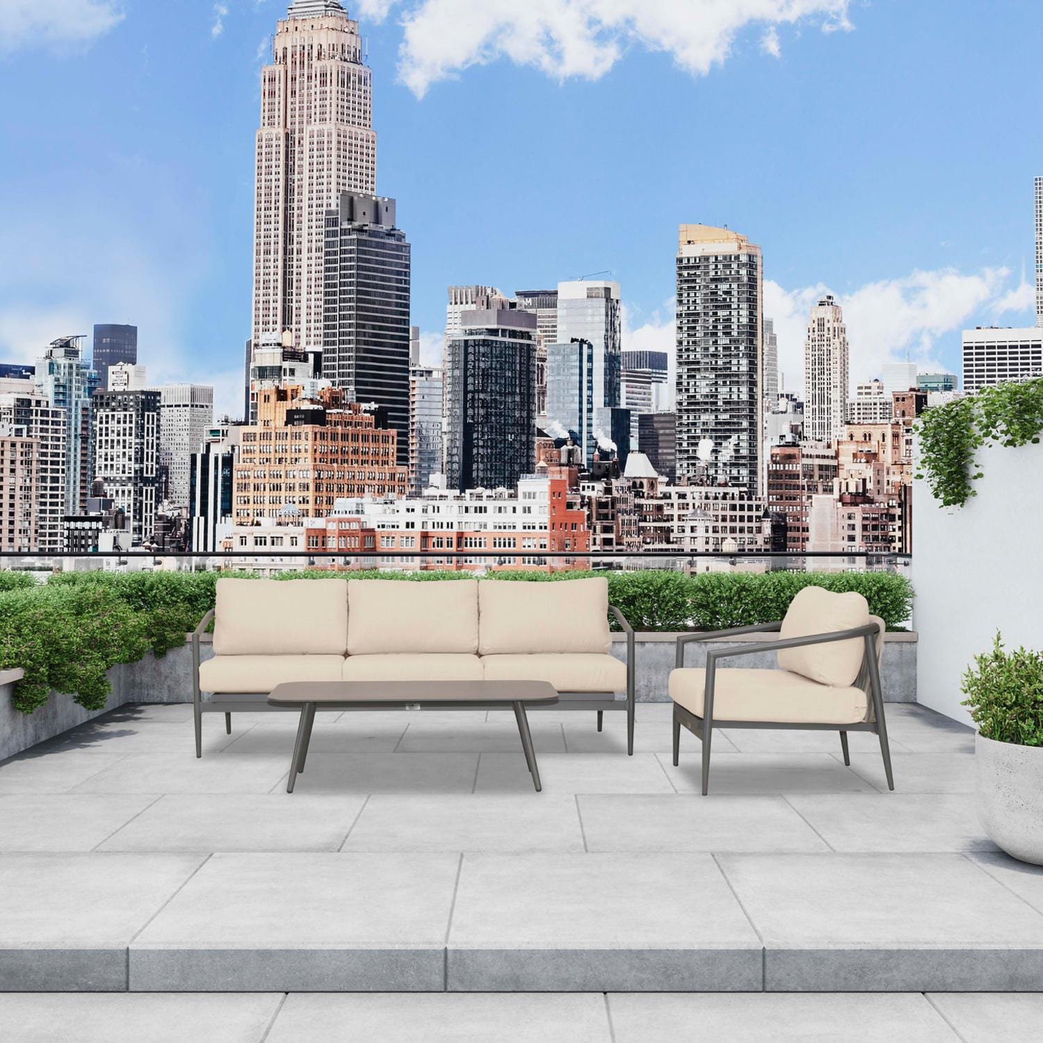 The Midnight Cove 3 Piece Sofa Set in a Slate finish with Canvas Flax cushions is an imagined Mid Century Modern design brought to life with Pebble Gray Olefin rope. Accented with tapered legs, subtle curves and an intertwining roped back for flair, the silhouette of the Midnight Cove collection is a sophisticated work of art. Midnight Cove was efficiently designed to be both compact in its footprint while still offering full sized deep seating comfort. Its fully-welded aluminum frames are treated with a powder-coated finish to ensure lasting performance across the seasons. Beautiful Pebble Gray Olefin rope compliment the frames making it both visually appealing and durable in all types of climates. The cushions are made in the USA with quick-drying, Dacron and UV-treated, marine-grade PremoBond thread to create a supportive, yet comfortable seat that is meant to last throughout the seasons. All cushions are constructed from Sunbrella performance fabrics, which carry a 5-year fade warranty. This piece is offered in 9 popular Sunbrella fabric options which are fade resistant, easy to clean, and ready to ship within days of placing an order! The sleek, aluminum table perfectly compliments the rest of the deep seating set!