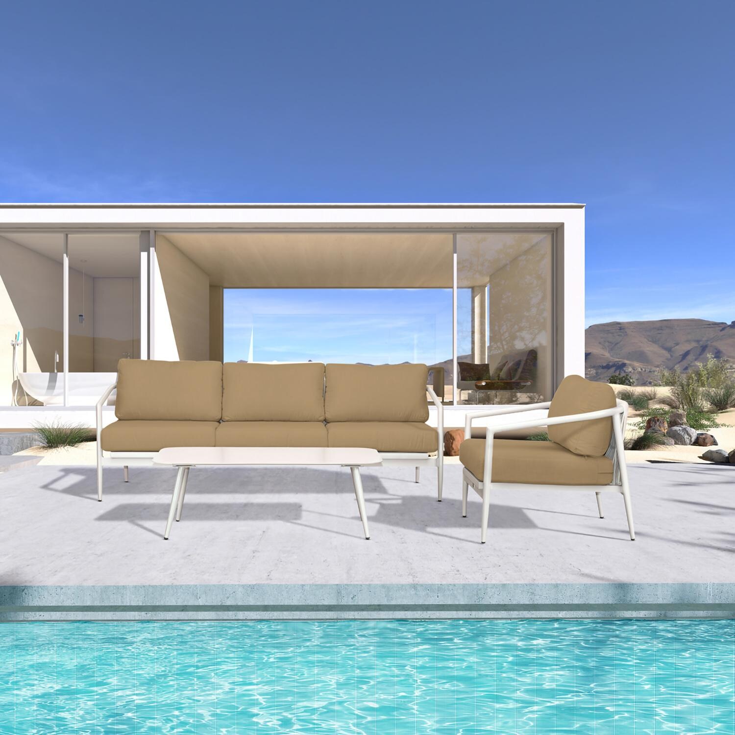 The Midnight Cove 3 Piece Sofa Set in an Urban Stone finish with Heather Beige cushions is an imagined Mid Century Modern design brought to life with Carrera Olefin rope. Accented with tapered legs, subtle curves and an intertwining roped back for flair, the silhouette of the Midnight Cove collection is a sophisticated work of art. Midnight Cove was efficiently designed to be both compact in its footprint while still offering full sized deep seating comfort. Its fully-welded aluminum frames are treated with a powder-coated finish to ensure lasting performance across the seasons. Beautiful Carrera Olefin rope compliment the frames making it both visually appealing and durable in all types of climates. The cushions are made in the USA with quick-drying, Dacron and UV-treated, marine-grade PremoBond thread to create a supportive, yet comfortable seat that is meant to last throughout the seasons. All cushions are constructed from Sunbrella performance fabrics, which carry a 5-year fade warranty. This piece is offered in 9 popular Sunbrella fabric options which are fade resistant, easy to clean, and ready to ship within days of placing an order! The sleek, aluminum table perfectly compliments the rest of the deep seating set!