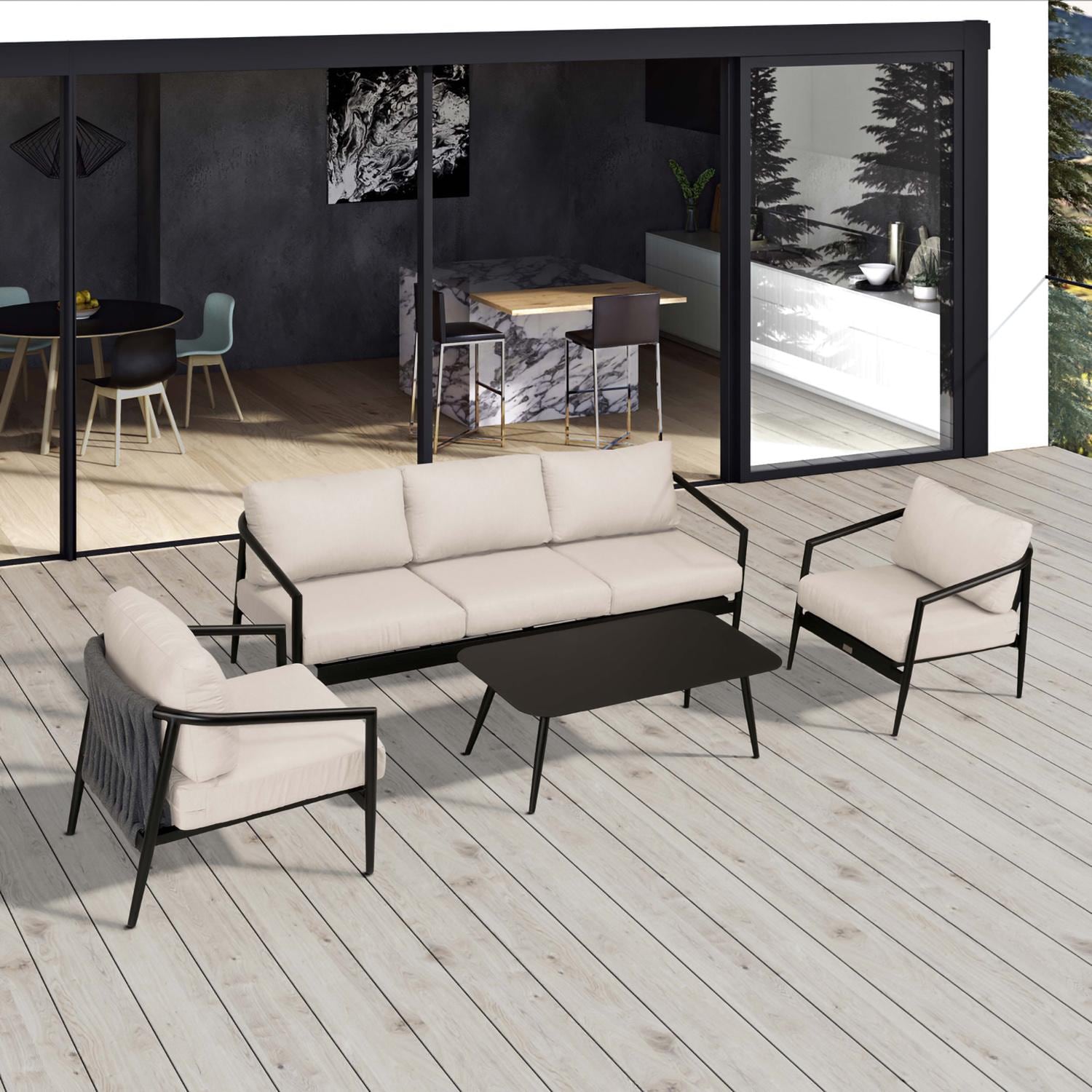 The Midnight Cove 4 Piece Sofa Set in a Black finish with Cast Silver cushions is an imagined Mid Century Modern design brought to life with Carbon Olefin rope. Accented with tapered legs, subtle curves and an intertwining roped back for flair, the silhouette of the Midnight Cove collection is a sophisticated work of art. Midnight Cove was efficiently designed to be both compact in its footprint while still offering full sized deep seating comfort. Its fully-welded aluminum frames are treated with a powder-coated finish to ensure lasting performance across the seasons. Beautiful Carbon Olefin rope compliment the frames making it both visually appealing and durable in all types of climates. The cushions are made in the USA with quick-drying, Dacron and UV-treated, marine-grade PremoBond thread to create a supportive, yet comfortable seat that is meant to last throughout the seasons. All cushions are constructed from Sunbrella performance fabrics, which carry a 5-year fade warranty. This piece is offered in 9 popular Sunbrella fabric options which are fade resistant, easy to clean, and ready to ship within days of placing an order! The sleek, aluminum table perfectly compliments the rest of the deep seating set!